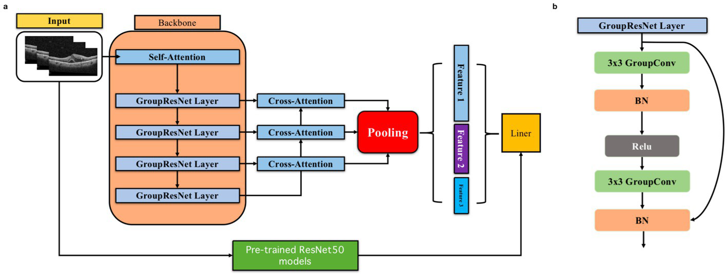 Specifically, ResNet50 is used as the base model to extract global features, and we build upon it by introducing four layers of residual connectivity. These layers include our designed GroupResNetLayer, which incorporates a 3 × 3 grouped convolution, batch normalization (BN), a ReLU activation function, followed by another 3 × 3 grouped convolution, BN, and a residual connection. This structure enhances feature diversity and computational efficiency.