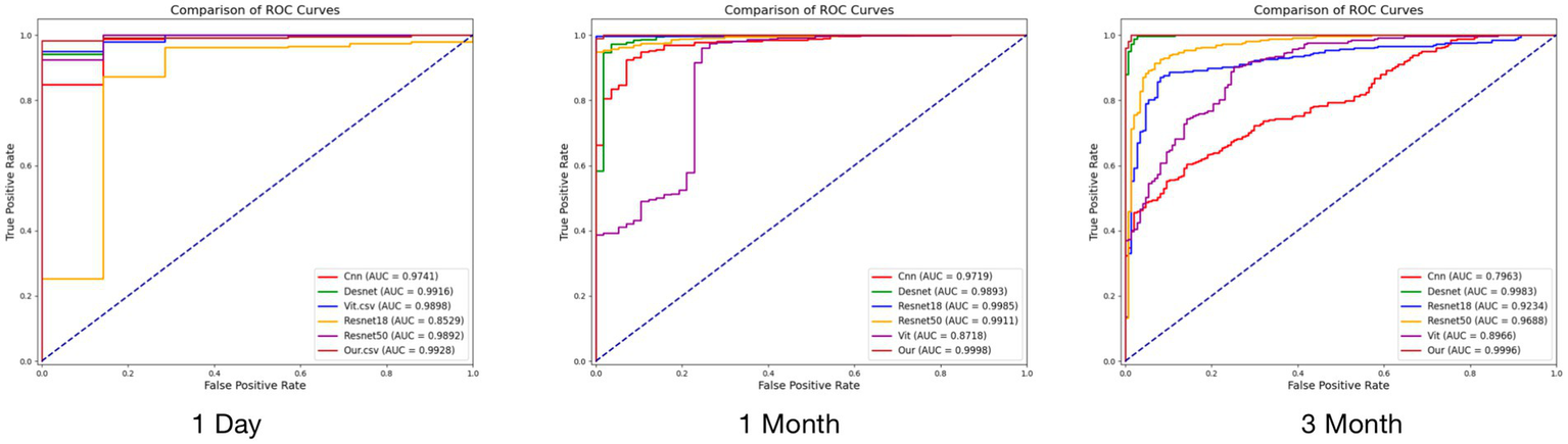 Our proposed new model performed well in tests at different postoperative time points (see Figure 4 and Table 4 for details). On the first postoperative day, the model’s F1, MCC, AUC, and ACC reached 0.9937, 0.7653, 0.9928, and 0.9877, respectively. On the first postoperative month, the F1 and MCC were 0.9961 and 0.998, respectively, and in the test on the third postoperative month, the model’s F1 and AUC were 0.9939 and 0.9996. These results indicate that our model achieved excellent performance in prediction at all time points, showing excellent accuracy and reliability.