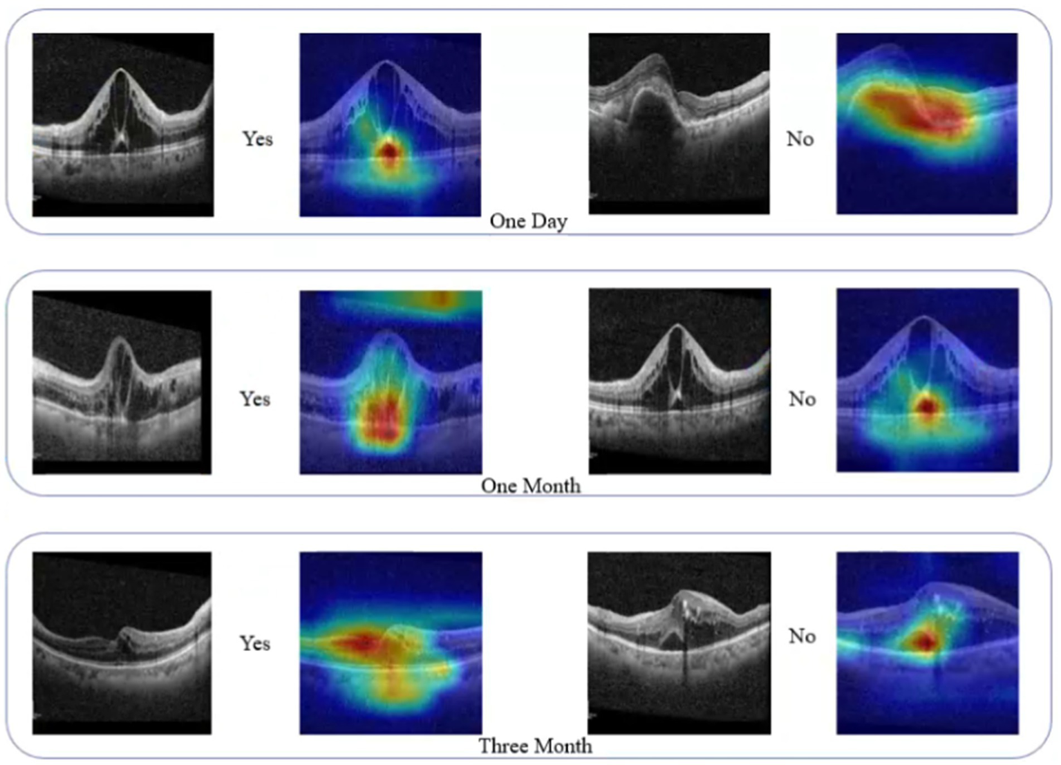 The clinical interpretability of the model was significantly enhanced through Grad-CAM technology. The heatmaps generated by Grad-CAM revealed the regions of the OCT images the model focused on when making predictions, providing insights into the model’s decision-making basis. This visualization method allows clinicians to intuitively observe the key pathological areas the model focuses on, such as the specific location of macular edema, enhancing trust in the model’s predictions. The heatmaps generated by Grad-CAM were consistent with clinical observations, validating the model’s effectiveness. By clearly identifying the regions of interest, clinicians can better understand and verify the model’s predictions, improving the accuracy and efficiency of clinical decision-making.