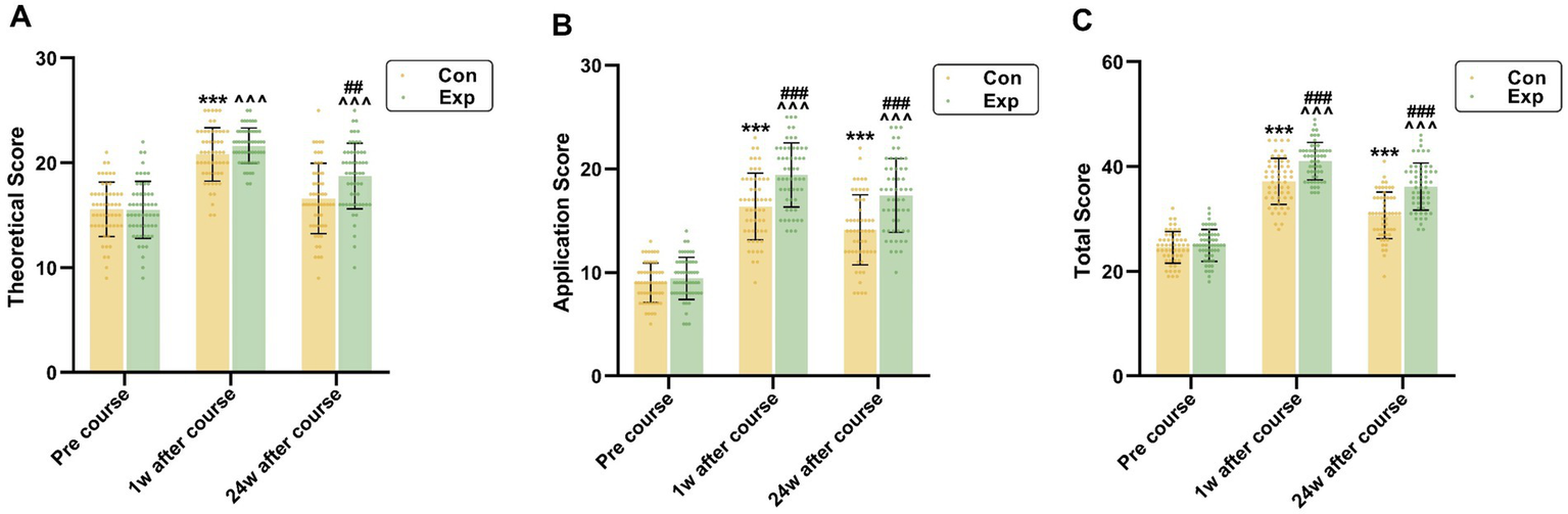 HAI tests scores in Con (n = 54) and Exp (n = 55) groups at different time points. (A) Theoretical Score; (B) Application Score; (C) Total Score. Con: control group with the traditional LBL method. Exp: experimental group with the CDIO method. Data are presented as mean ± standard deviation (SD). ***p < 0.001 vs. pre-course in Con group, ^^^p < 0.001 vs. pre-course in Exp group, ###p < 0.001 vs. application and total scores in Con group at 1w and 24w after course, ## p < 0.01 vs. theoretical scores in Con group at 24w after course.