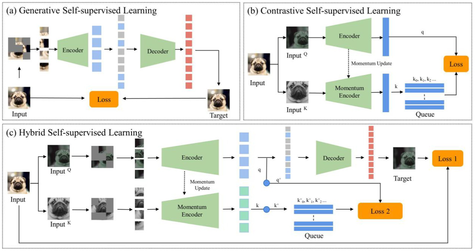 The general structure of self-supervised learning. (A) Generative self-supervised learning; (B) Contrastive self-supervised learning; (C) The proposed hybrid self-supervised learning.