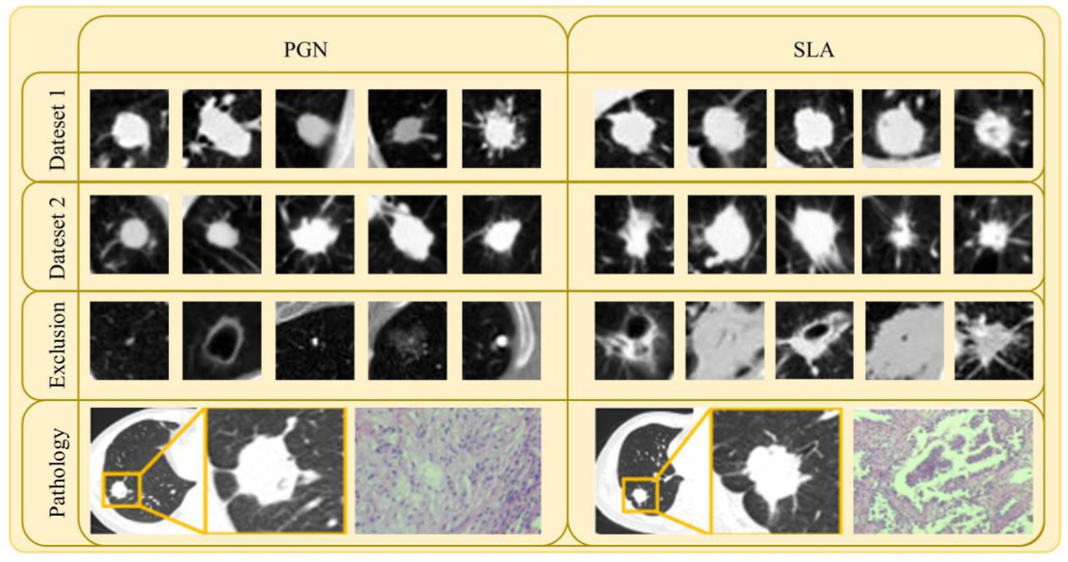 Samples of lesion images (CT and pathology) and excluded lesion images for PGN and SLA in Dataset 1 and Dataset 2.
