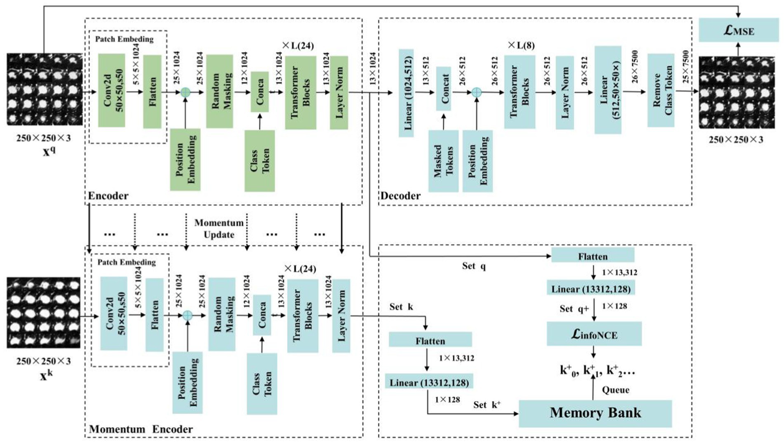 In this section, we introduce the components of the MAEMC-NET model, including the encoder module, decoder module, and momentum encoder module, along with the specifics of the momentum update operation and the implementation of the dictionary as a queue. The detailed network architecture of this module is visually represented in Figure 4. The encoder and momentum encoder modules utilize the ViT-large model, characterized by 24 stacked encoder blocks, a token vector length of 1,024, and 16 heads in the multi-head attention mechanism. These modules exclusively process un-masked patches. Initially, image data is segmented into patches of a specified size and then flattened into one-dimensional arrays. Subsequently, these arrays undergo a linear transformation, which is then merged with the position embeddings of the original image and augmented by the addition of a class token at the beginning. Owing to the asymmetric Encoder-Decoder architecture employed, where the encoder only processes un-masked patch information to conserve computational resources, the decoder module is configured with 8 stacked decoder blocks and a token vector length of 512. The decoder is tasked with processing not only the un-masked tokens encoded by the Encoder but also the masked tokens. It is important to note that these masked tokens are not derived from the embedded transformation of the previously masked patches; rather, they are learnable and shared across all masked patches.