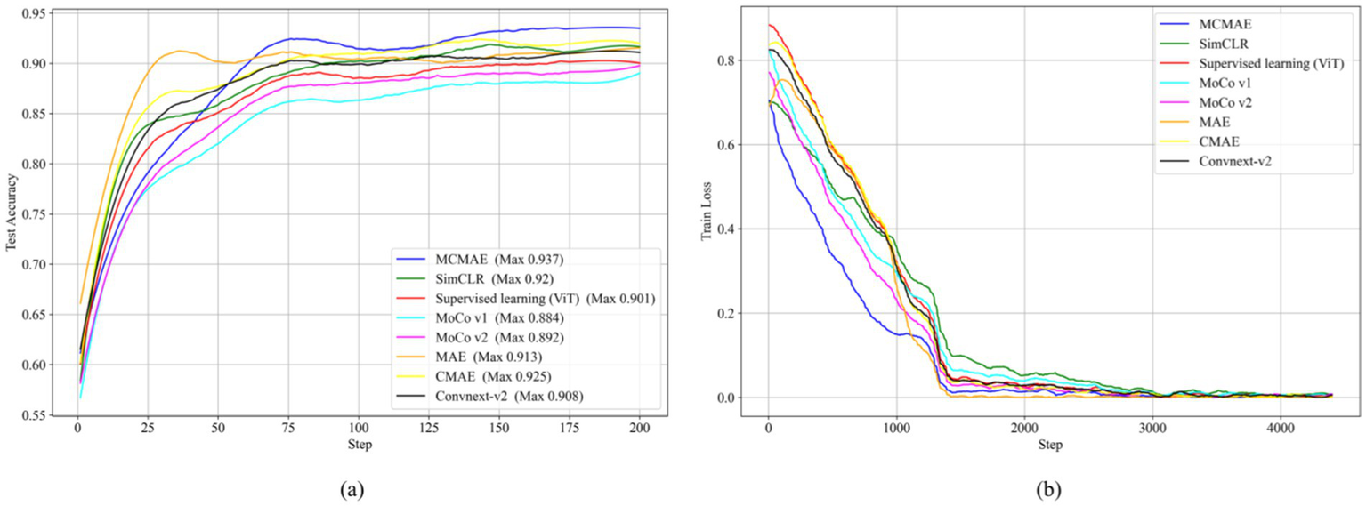 We incorporated the MAEMC-NET model, training and testing all variants and comparison models on an NVIDIA GeForce RTX 4070 with 12GB memory. This was implemented using PyTorch (version 1.7), with all graphics created using matplotlib in Python. Our network, an evolution of MAE and MoCo, pre-trained model parameters were not found to be loadable into MAEMC-NET, necessitating training from scratch. To mitigate overfitting, we implemented an early stopping mechanism during the fine-tuning phase. The validation loss was monitored after each epoch, and training was halted if no improvement was observed for 10 consecutive epochs. This helped in preserving the model’s generalization ability.