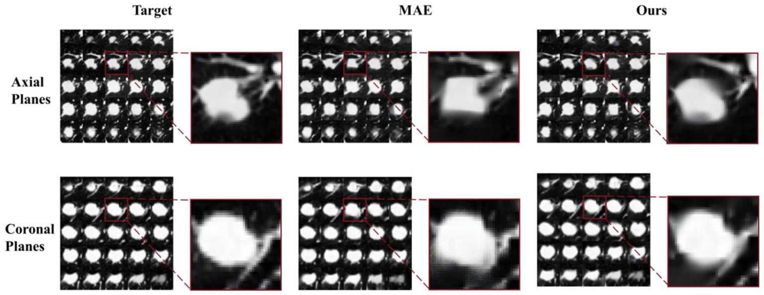 In alignment with the Vision Transformer (ViT) architecture and the intermediate task designed for this experiment, we amalgamated training set images composed of multiple lesion images (39). They were derived from a previously obtained preprocessed dataset extracting sample pairs from multi-slice axial and coronal views of the lesion. We divided these composite images into regular, non-overlapping patches, treating each patch independently. Specifically, we partitioned the 250 × 250 images into 25 uniform, non-overlapping 5050 patches, each encompassing a portion of the lesion image. Subsequently, these patches underwent uniform, randomly distributed sampling, with a certain proportion being masked.