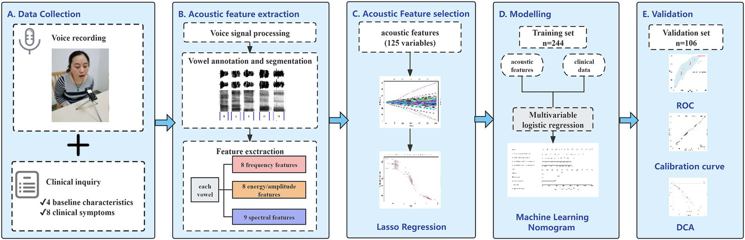 Workflow for development and validation of the proposed nomogram for prediction of lung cancer based on acoustic–clinical features. (A) Data collection, collecting voice signals and clinical data from the participants before pathological examination; (B) acoustic feature extraction, voice annotation, and segmentation, extracting 25 acoustic features for each vowel; (C) classification based on pathological examination results, using LASSO regression to screen lung cancer related acoustic features; (D) establishing a model in the training set and developing an acoustic–clinical nomogram for predicting lung cancer; (E) performing ROC analysis, calibration analysis, and decision curve analysis in the training set and the test set.