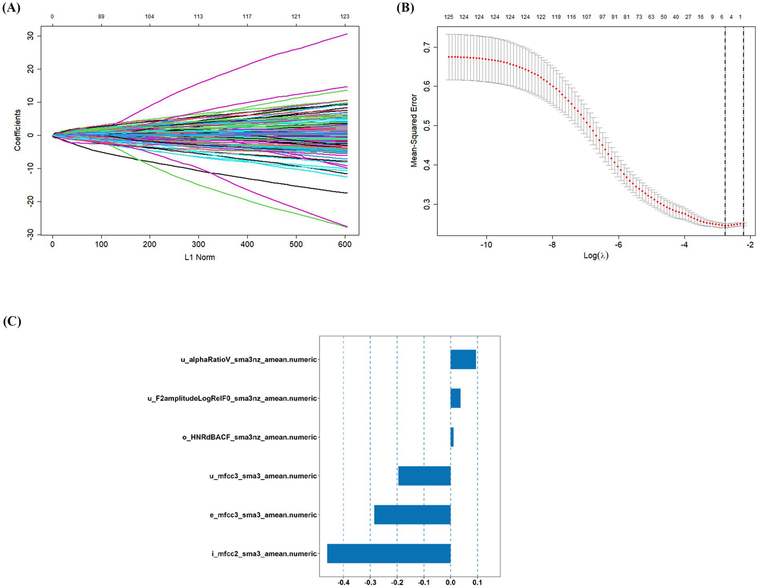 Screening of variables based on LASSO regression. (A) The variation characteristics of the coefficient of variables. Each curve in the figure represents the trajectory of the coefficient change for each independent variable. The y-axis represents the value of the coefficient, the lower horizontal axis represents the L1-norm value of the coefficient, and the upper horizontal axis represents the number of non-zero coefficients in the model at that time; (B) the selection process of the optimum value of the parameter λ in the LASSO regression model by 10-fold cross-validation method. In the LASSO model, the coefficient profiles of 125 acoustic features were drawn from the log (λ) sequence. Vertical dotted lines are drawn at the minimum mean square error (λ = 0.110) and the standard error of the minimum distance (λ = 0.063); (C) coefficients of six variables screened by LASSO regression. The text column on the left displayed the names of selected features. The bar chart on the right displayed the corresponding coefficient for each feature.