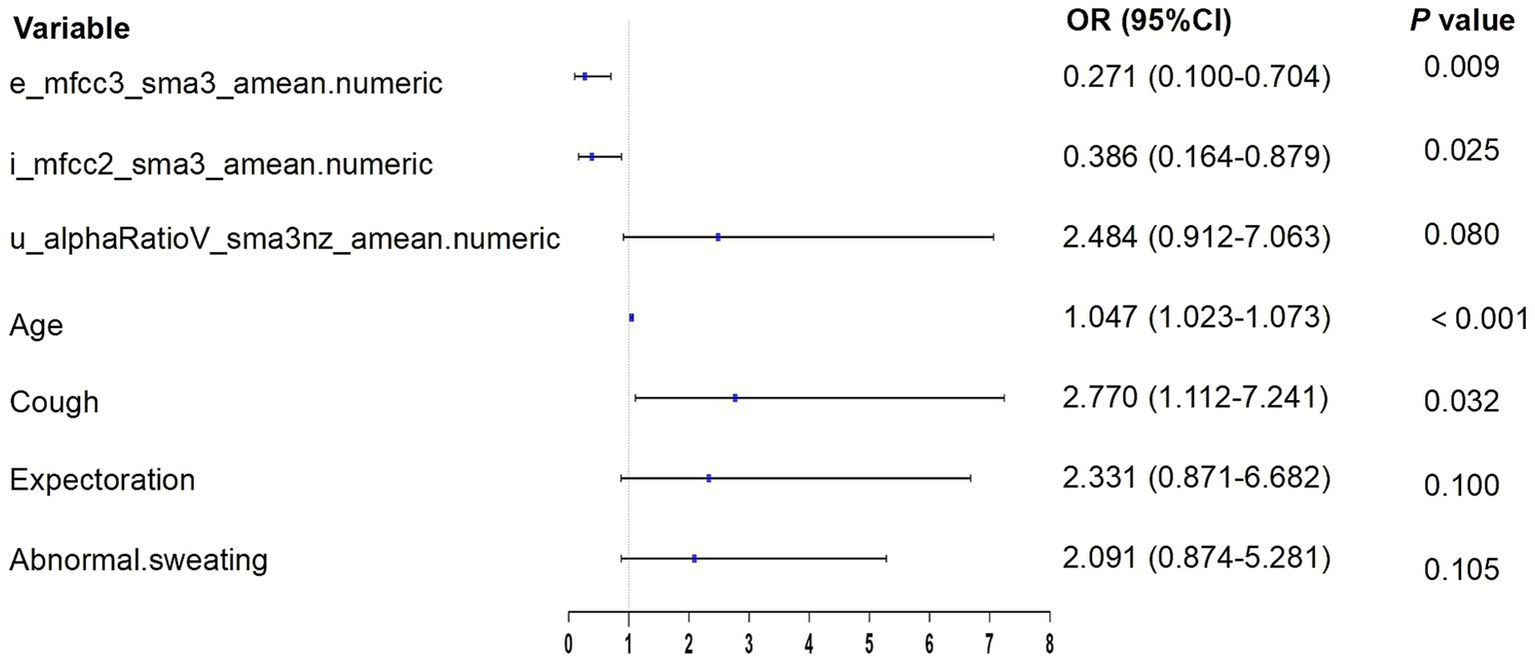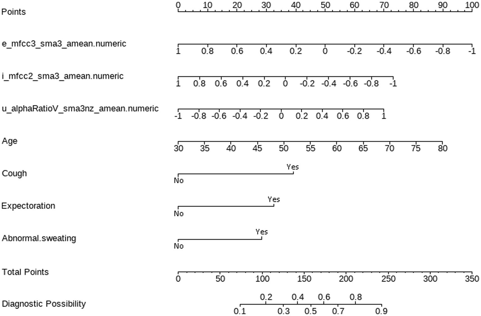 According to the results of multivariate logistic regression with backward elimination, the model containing e_mfcc3, i_mfcc2, u_alphaRatio, age, cough, expectoration, and abnormal sweating achieved minimal AIC value in the training cohort (Table 2; Figure 4). In addition, we assessed multicollinearity using variable inflation factors (VIF) and found that the VIF values for the selected variables were below 3. This model was presented as a nomogram for predicting lung cancer (Figure 5).