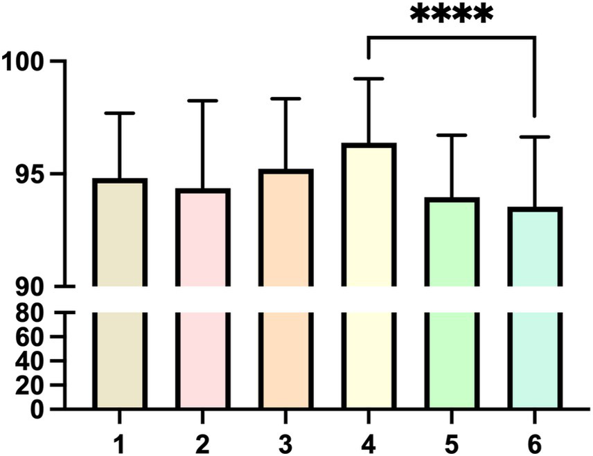 Peer evaluation scores between groups. The figure shows the results of peer evaluation between groups in one class, and there is a significant difference between the highest-scoring Group 4 and the lowest-scoring Group 6, **** p < 0.0001.
