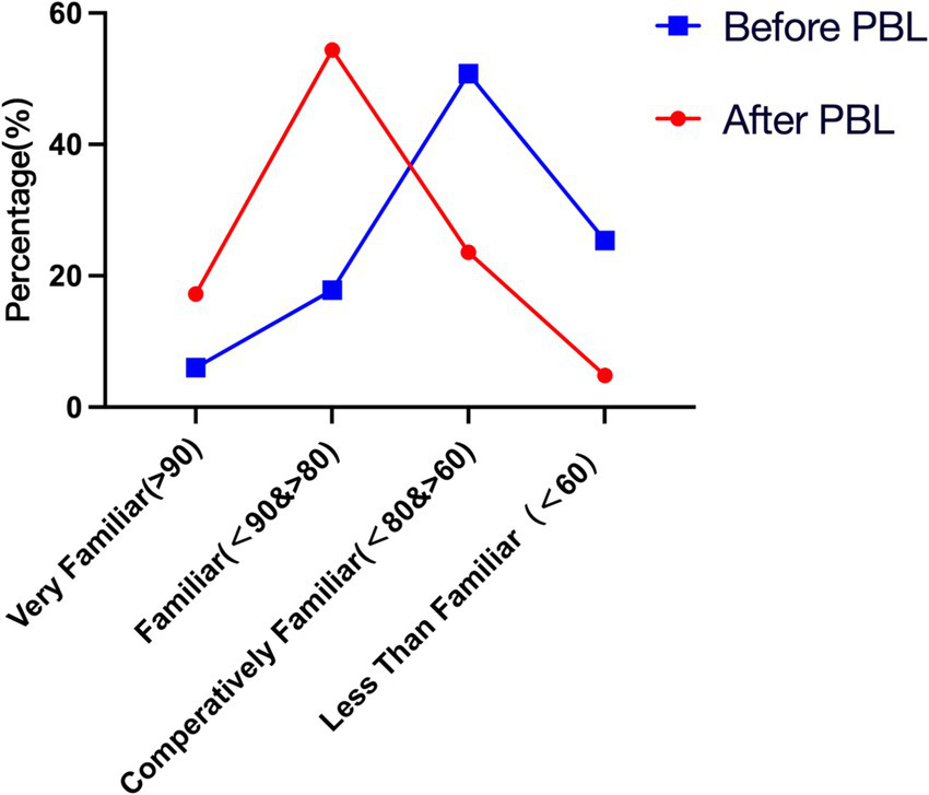 Students’ understanding of congenital malformations before and after using the PBL teaching method. The blue line in the figure represents students’ understanding of congenital malformations before the PBL teaching method, while the red line represents their understanding after the PBL teaching method.
