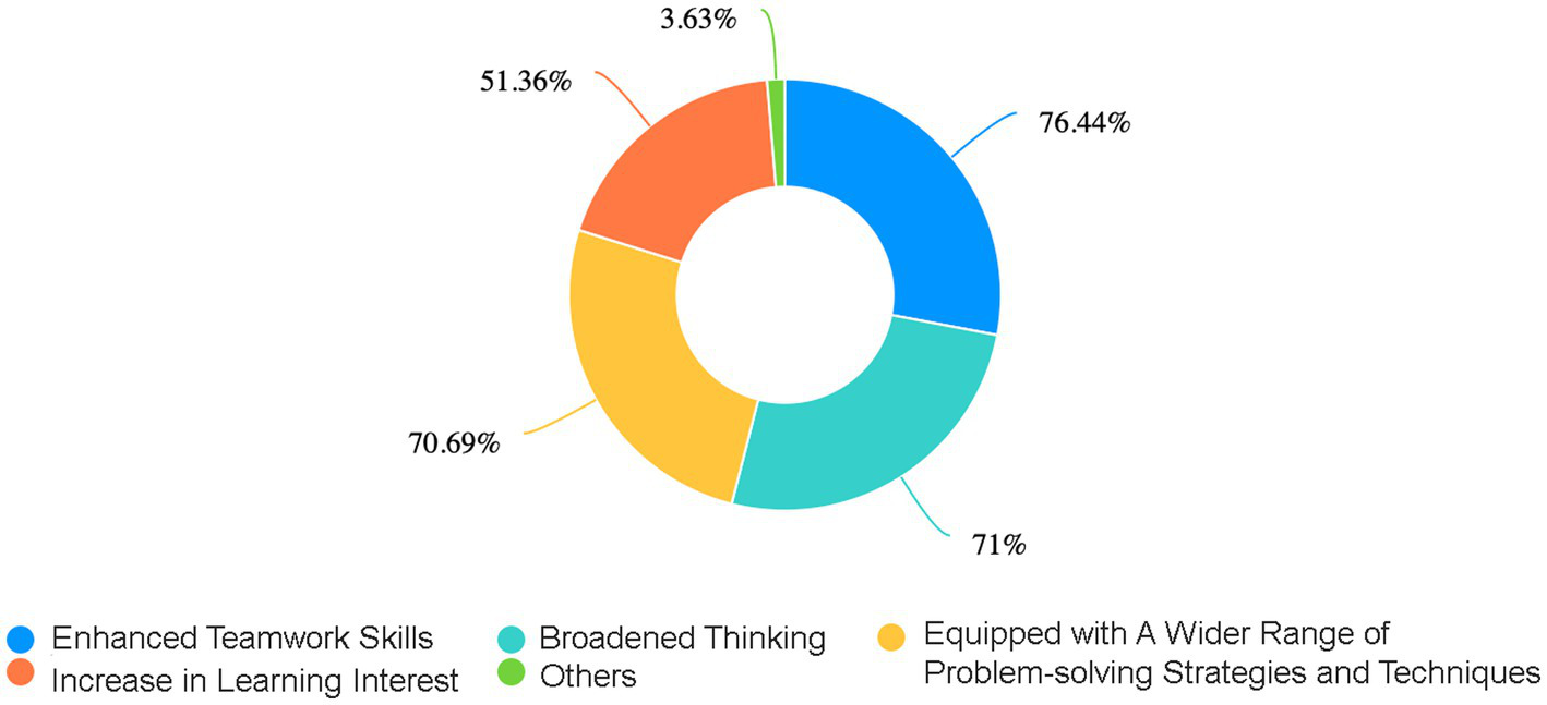 The ring chart presents a distribution of the percentages of the various positive impacts for students after adopting the PBL teaching method. These data outline the percentages of “Enhanced Teamwork Skills,” “Broadened Thinking,” “Equipped with A Wider Range of Problem-solving Strategies and Techniques,” and “Increase in Learning Interest”.
