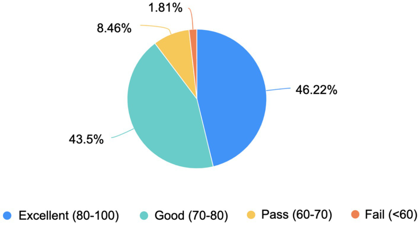 Self-assessed mastery of congenital malformations content among students. The pie chart illustrates the distribution of students’ self-assessed mastery of congenital malformations content, based on a scoring system ranging from 0 to 100. The mastery levels are categorized into four groups: excellent (80–100), good (70–80), pass (60–70), and fail (<60). The corresponding percentages of students in each category are as follows: excellent (80–100): 46.22%, good (70–80): 43.5%, pass (60–70): 8.46%, fail (<60): 1.81%.