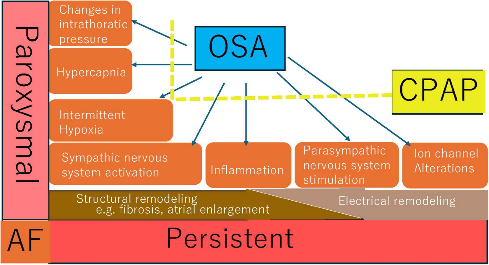 The existing evidence shows divergent results regarding the effectiveness of CPAP treatment effectiveness in preventing the onset or recurrence of AF. Many studies have explored how CPAP can improve atrial remodeling or some electrocardiophysiological surrogate endpoints in patients with OSA. Some clinical studies have demonstrated that CPAP can reduce the incidence of AF in OSA patients. However, there is a lack of evidence regarding whether CPAP can delay the progression of AF to a persistent state. Furthermore, the impact of CPAP on AF incidence may also depend on the characteristics of the population, as its effects in the general OSA population may differ from those in patients who have undergone AF cardioversion (i.e., recurrence rates).