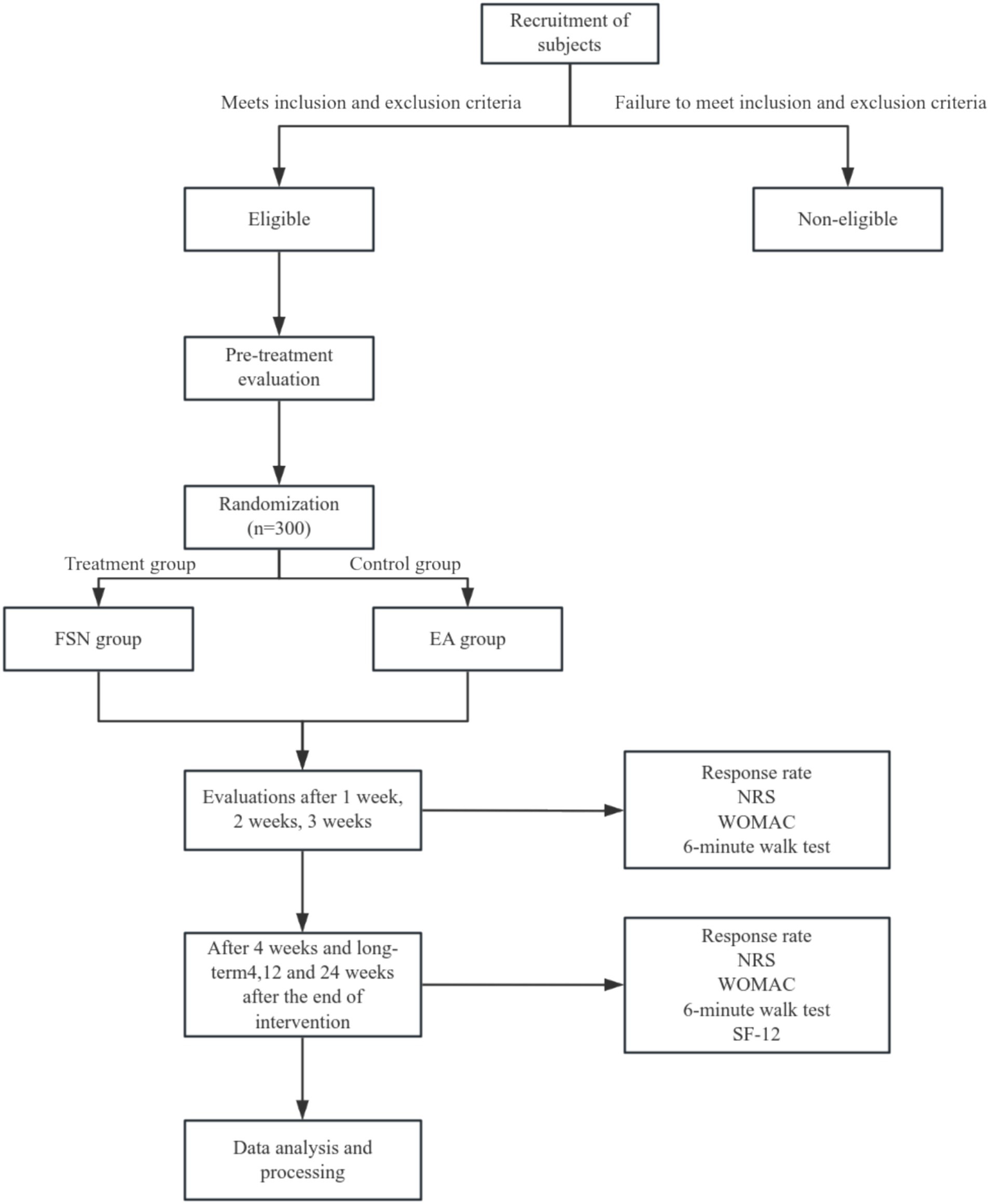 Subjects will receive either FSN or EA treatment. Both groups will be treated for 4 weeks, with 3 treatments per week and 1 treatment every other day, for a total of 12 times. The primary outcome measure is the response rate of knee symptom relief after 4 weeks of treatment (the proportion of patients with a decrease of ≥2 points on the NRS and a decrease of ≥6 points on the WOMAC at the end of 4 weeks of treatment compared with baseline). Secondary outcome indicators is the response rate of knee symptom relief, NRS, WOMAC scale score, 6-min walk test at 1, 2, 3, and 4 weeks of intervention and 4, 12, and 24 weeks after the end of intervention, as well as the Brief Quality of Life Scale (SF-12) score at 1, 4, and 4 weeks after the end of intervention. The flow chart of this experiment is shown in Figure 1.