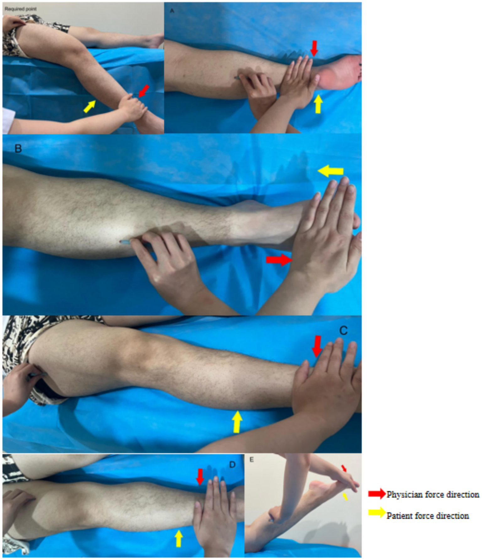 (2) Choose the needle entry points (Figure 4): Including 1 necessary point, which is a reference to previous studies (15, 20), the quadriceps muscle is selected and the entry point is between the line connecting the anterior superior iliac spine and the upper 1/3 of the lateral superior border of the patella. According to different pain sites, clinical manifestations and the finding of the affected muscle, choose 1 to 3 optional points among the following points of needle entry: A for pain in the posterior side of the knee, choose the midpoint of the line connecting the popliteal fossa and the heel. For lateral knee pain, choose B the lateral border of the tibia, at the midpoint of the line between the external knee eye and the tip of the external ankle, or C the upper 1/3 of the line between the highest point of the greater trochanter of the femur and the upper outer edge of the patella. For medial knee pain, choose D the lower 1/4 of the line connecting the midpoint of the pubic symphysis with the inner superior border of the patella, or E the upper 1/3 of the line connecting the tip of the inner medial ankle of the lower leg with the medial tibial condyle.