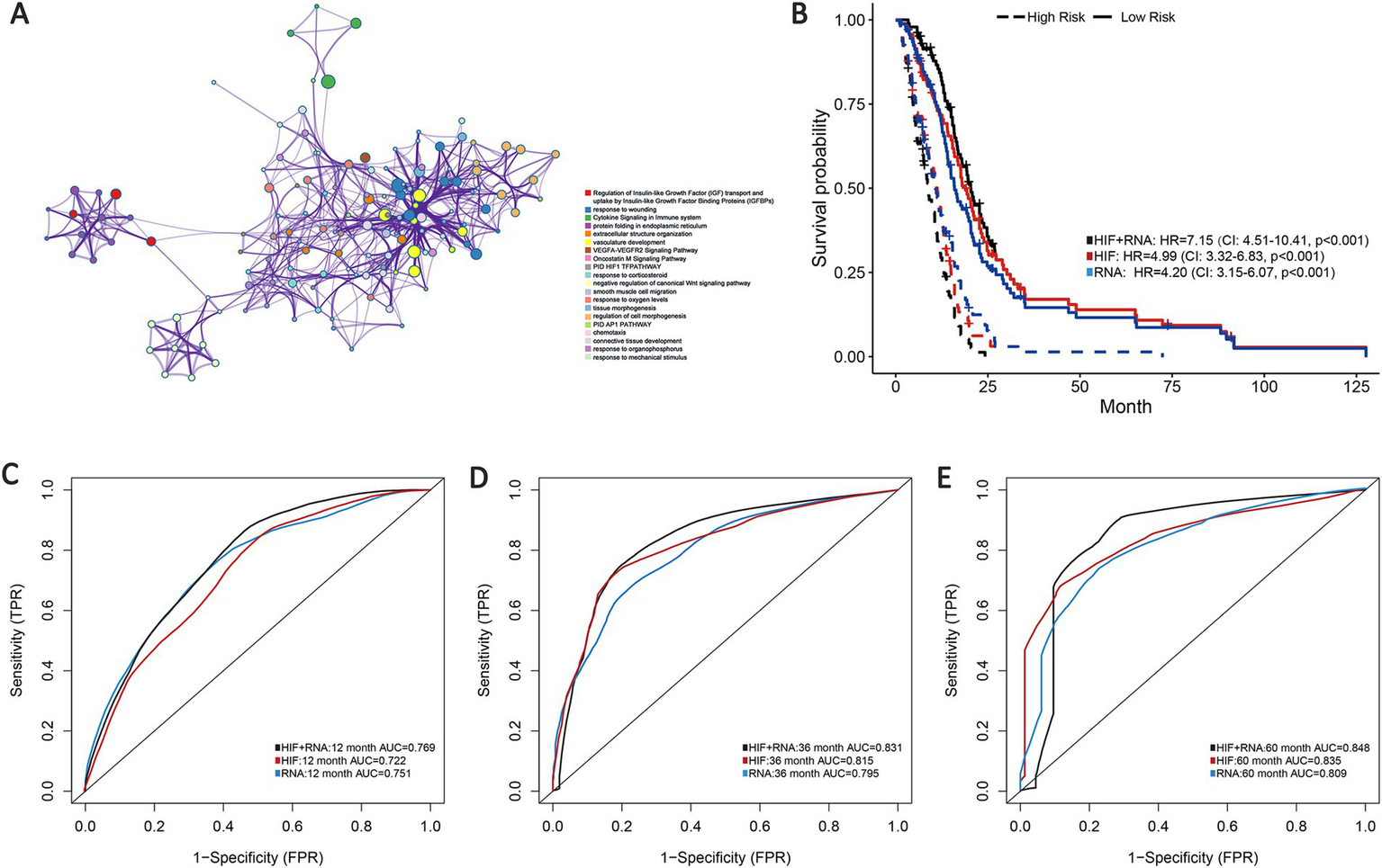 Prognostic models integrating HIF and transcriptomics (RNA). (A) Metascape enrichment network visualization cluster of genes and associated biological pathways based on training set. Each circled node represents a term and each color represents its cluster identification, showing the intra-cluster and inter-cluster similarities of enriched terms. (B) Kaplan–Meier curves of prognostic models (HIF, RNA, and HIF + RNA) in the validation set. (C–E). The (C) 1-year, (D) 3-year and (E) 5-year AUCs of the three prognostic models in the validation set.