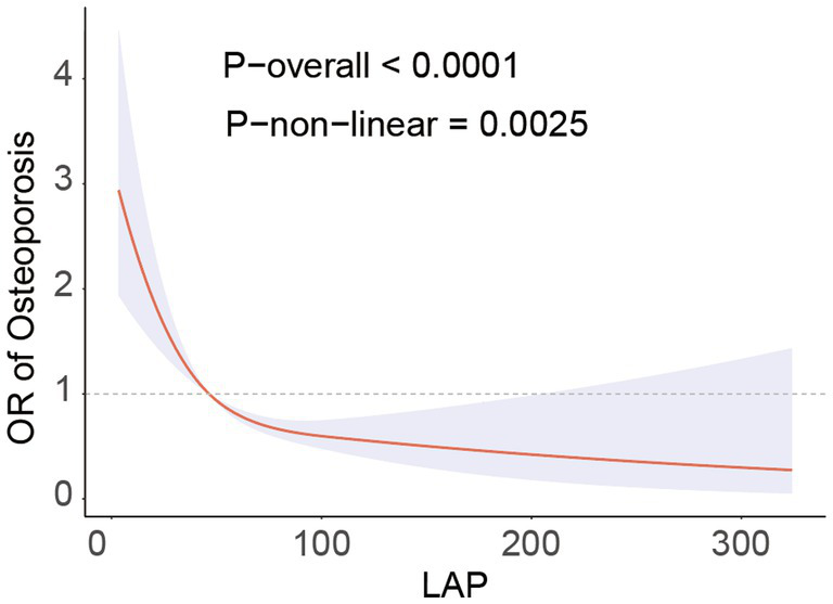 This study used data from the NHANES cycles 2007–2010, 2013–2014, and 2017–2018, including 4,200 adults aged 50 and above. LAP was calculated using waist circumference and triglyceride levels, whereas osteoporosis was identified using information from dual-energy X-ray absorptiometry (DXA) assessments of bone mineral density (BMD). Restricted cubic spline (RCS) analysis was evaluated the relationship between LAP and osteoporosis. Additionally, subgroup analyses were conducted to assess the impact of demographic characteristics and health status on the relationship between LAP and osteoporosis.