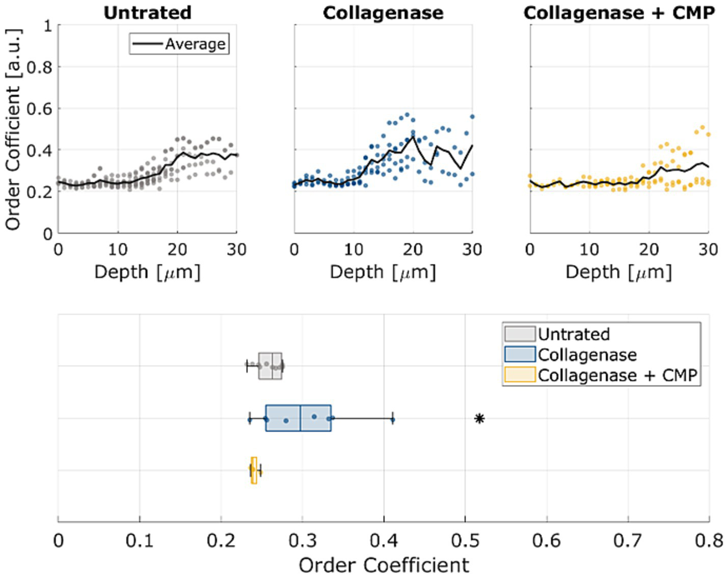 OCs as a function of depth for untreated, post-collagenase treated, and post-collagenase- and CMP-treated tissue sample data. The black line represents the average OC across all 8 samples through depth for each treatment. At the bottom, standard boxplots based on the average through the whole depth are shown. The asterisk indicates statistical significance (p < 0.05) between the untreated and collagenase groups and between the collagenase and collagenase + CMP groups using ANOVA and a post hoc Tukey–Kramer analysis.