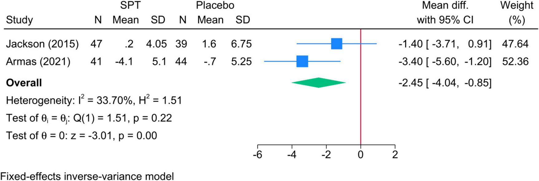 Random-effects meta-analyses were conducted to pool the mean differences (MD) in outcomes between the intervention (SPT) and control groups (placebo, OAT, and CPAP). The random effects model was employed to account for expected heterogeneity among included studies due to differences in study populations, intervention protocols, and outcome measures. This approach allows for the assumption that the true effect size may vary across studies, which is appropriate given the diversity of clinical settings and methodologies in the included studies.