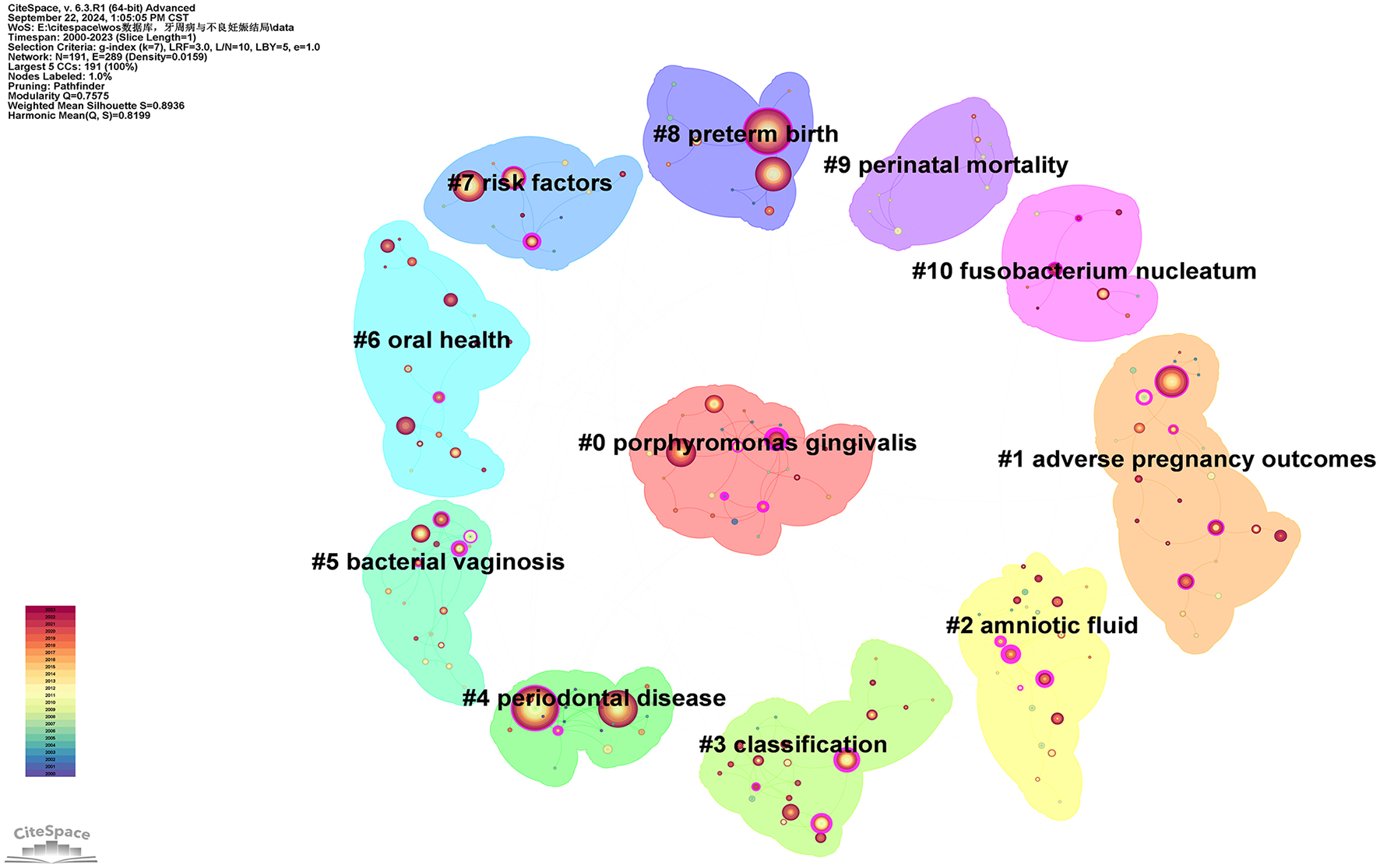 On September 22, 2024, articles and reviews on the connection between periodontal disease and adverse pregnancy outcomes were retrieved from the Web of Science Core Collection (WOSCC). CiteSpace [6.3.R1 (64-bit) Advanced] was used to perform knowledge mapping and bibliometric studies.