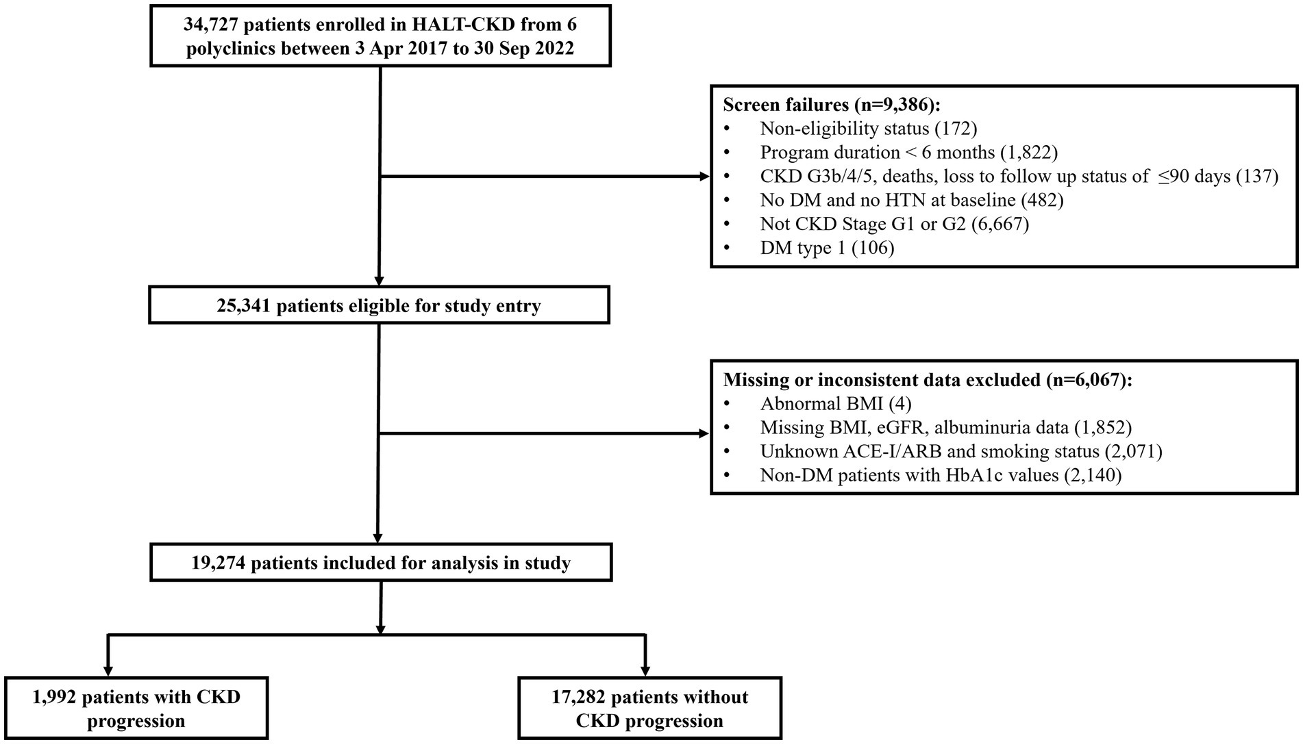 A total of 34,727 patients were enrolled in HALT-CKD from the six polyclinics between 3 Apr 2017 and 30 Sep 2022. After excluding 6,067 patients due to CKD stage, missing or inconsistent data, 19,274 early-stage CKD patients were analyzed with 1,992 (10.3%) having CKD progression. Table 1 shows the patient characteristics by CKD progression status.