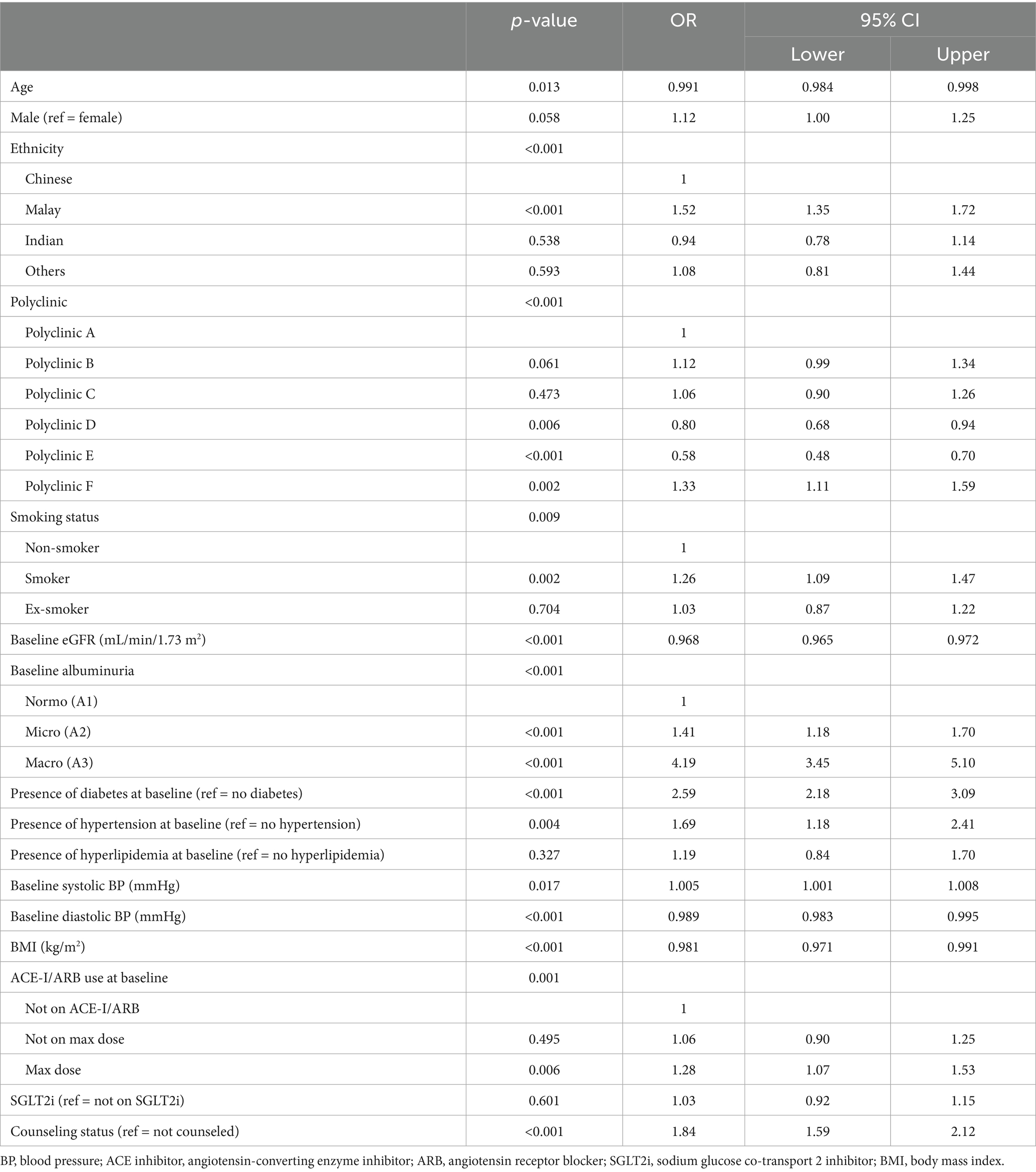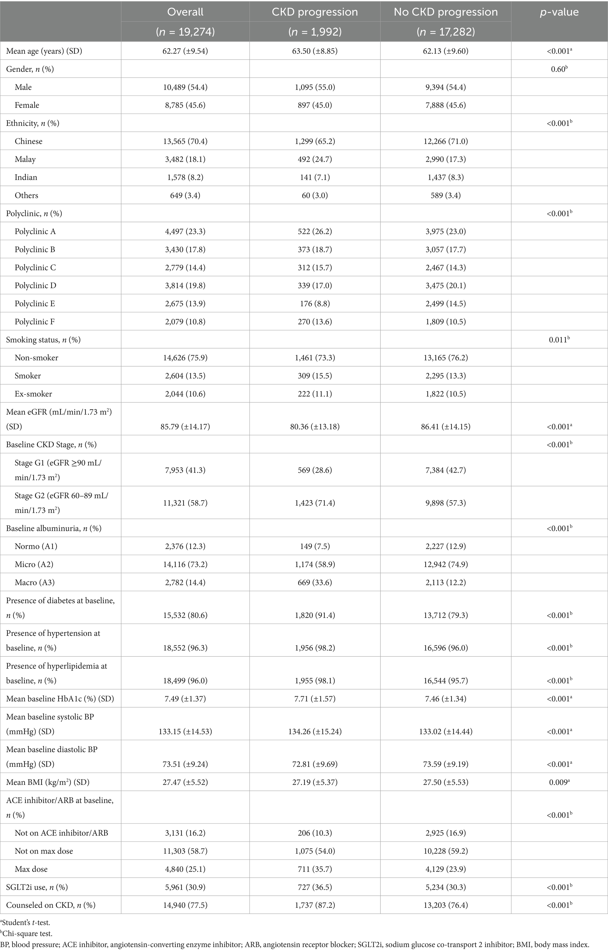 All statistical analysis was performed using R 4.3.1. Statistical significance was assessed at p < 0.05 using a two-tailed test. Descriptive statistics were performed with categorical variables expressed as counts and percentages and continuous variables expressed as mean and standard deviation. Patient characteristics were analyzed using Pearson chi-square test for categorical variables and Student’s t-test for continuous variables. The dependent variable was CKD progression following KDIGO definition (2). Potential factors studied include age, sex, ethnicity, polyclinic, CKD counseling status, body mass index (BMI), albuminuria status, HbA1c, CKD medications such as ACE inhibitor/ARB and SGLT2i, systolic and diastolic blood pressure (SBP and DBP), albuminuria, presence of chronic diseases such as hypertension, diabetes, and hyperlipidemia, and smoking. Multivariable logistic regression was performed using CKD progression as the outcome of interest, adjusted for all potential explanatory variables except HbA1c, which was excluded to prevent singularity error due to its close association with another variable, presence of diabetes. To ensure the absence of multicollinearity, variance inflation factors (VIFs) and tolerance values were calculated for all predictor variables, confirming that none exceeded the threshold for concern (VIF < 5, tolerance > 0.2). The results were expressed as odds ratios (ORs) with their 95% confidence intervals (CI) for multivariable analysis after adjustments.
