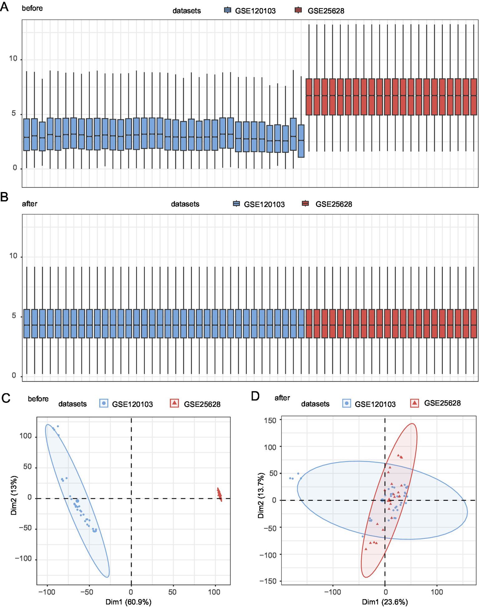 Batch effect removal for GSE73461 and GSE68004. (A) Boxplots showing the distribution of combined GEO datasets before batch removal. (B) Boxplots showing the distribution of post-batch integrated GEO datasets (combined datasets). (C) The PCA dataset before batch processing. (D) The PCA map of the combined GEO datasets after batch processing. Light red and blue represent the EMs datasets GSE25628 and GSE120103, respectively. PCA, principal component analysis; EMs, endometriosis.