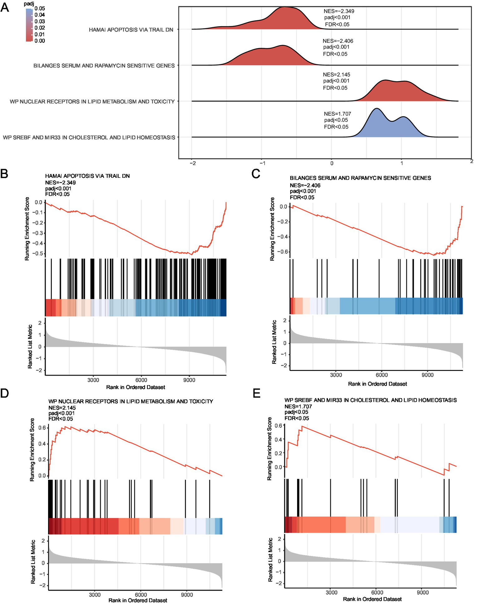 The effect of all gene expression levels in the combined GEO datasets was evaluated. The GSEA results for genes involved in BP, CC, and MF are shown in Figure 5A and Table 3. Genes whose expression was downregulated in the combined datasets were significantly enriched in hamai apoptosis via TRAIL DN (Figure 5B), bilanges serum, as well as rapamycin sensitivity (Figure 5C) and other biologically relevant functions and signaling pathways. In contrast, genes whose expression was upregulated were significantly enriched in nuclear receptors in lipid metabolism and toxicity (Figure 5D), as well as srebf and mir33 in cholesterol and lipid homeostasis (Figure 5E) and other biologically related functions and signaling pathways.