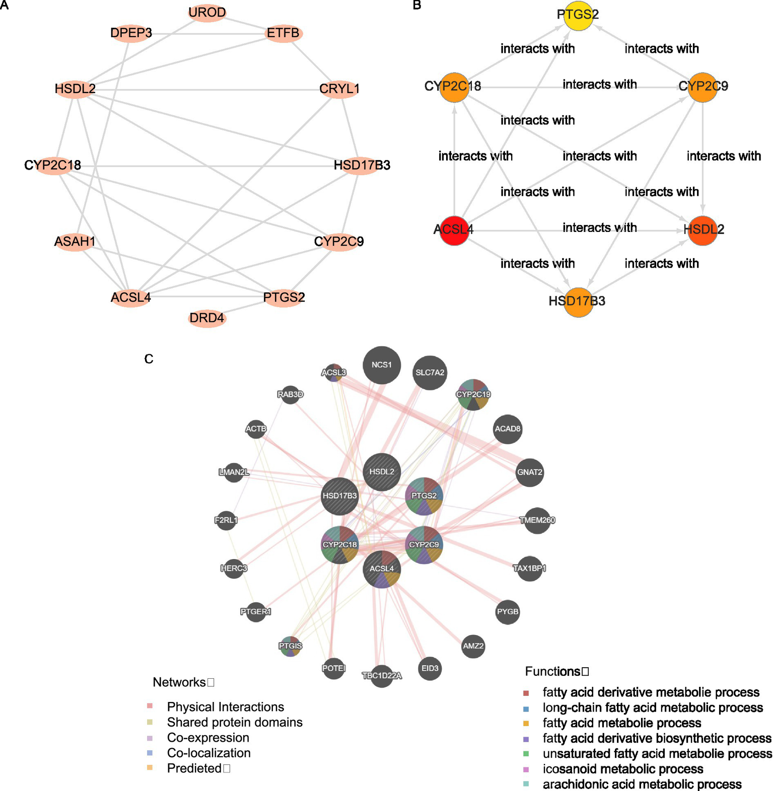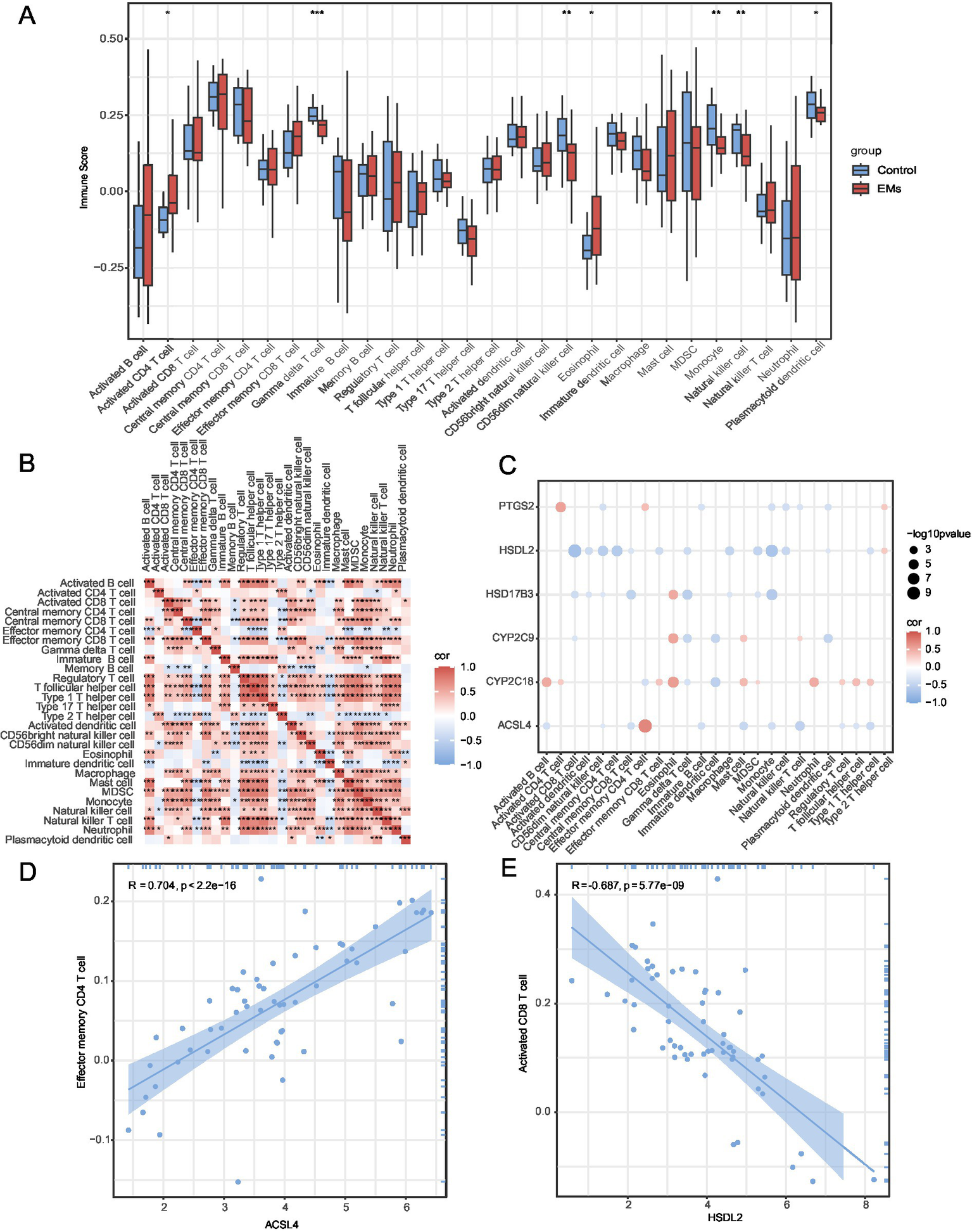 We identified 405 DEGs in the combined dataset, including 168 and 237 with upregulated and downregulated expression, respectively. Of these, 17 were FAMRDEGs. These genes were significantly involved in arachidonic acid and fatty acid metabolic processes. GSEA highlighted pathways such as Hamai_apoptosis_via_trail_dn for genes whose expression was downregulated, along with nuclear receptors in lipid metabolism and toxicity for genes with upregulated expression. The PPI network identified six hub genes: PTGS2, CYP2C9, HSDL2, HSD17B3, ACSL4, and CYP2C18. ACSL4 showed the strongest positive correlation with immune cell effector memory CD8 T cells, whereas HSDL2 showed the strongest negative correlation with immune cell-activated CD8 T cells.