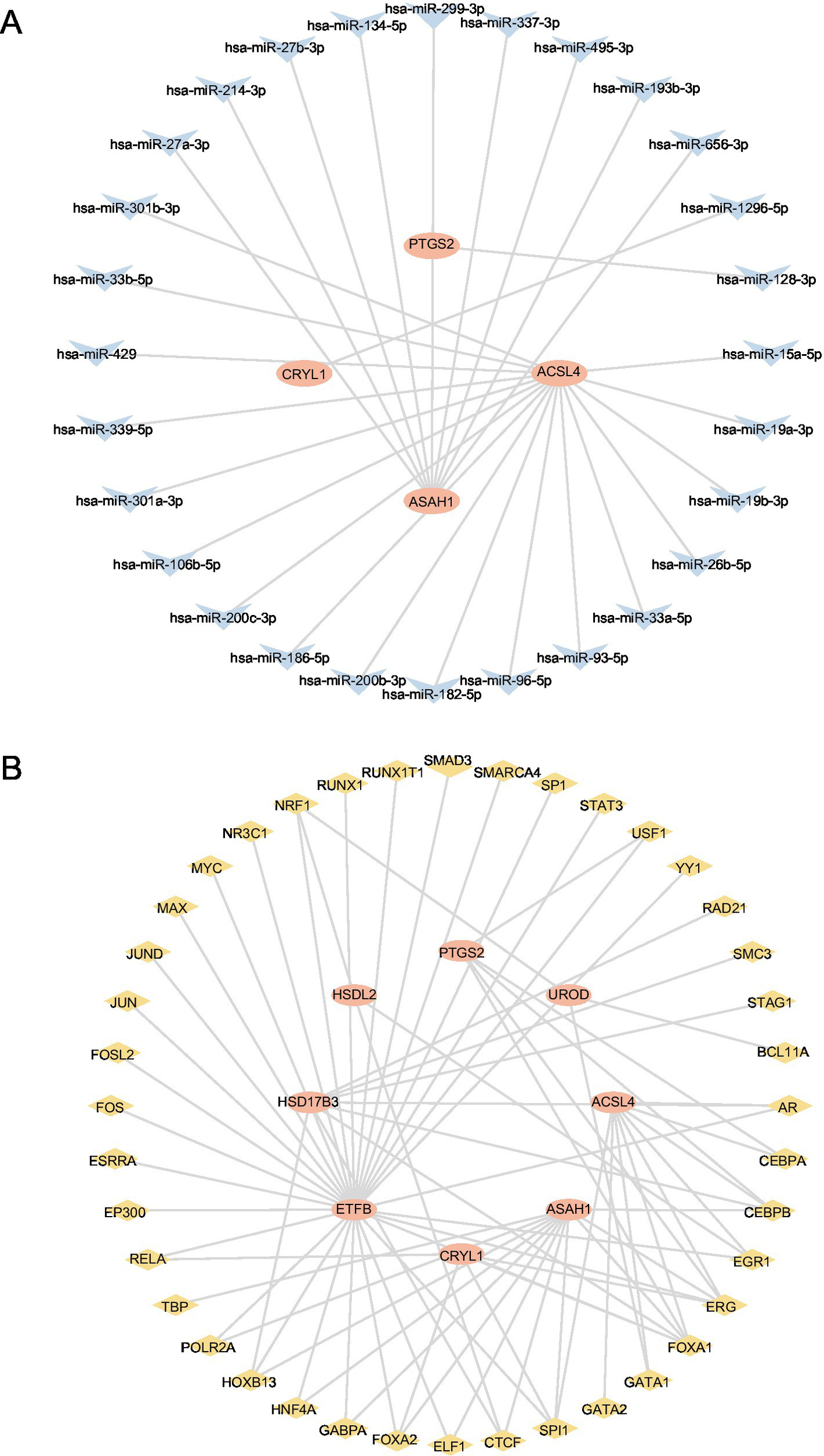 The R package sva was used to remove batch effects from the GSE120103 and GSE25628 datasets, resulting in the creation of a combined GEO dataset. Differential analysis of the combined GEO dataset was interposed with fatty acid metabolism-related genes. Differentially expressed genes associated with fatty acid metabolism (FAMRDEGs) were subsequently identified. Functional enrichment analyses were performed using the clusterProfiler package, whereas gene set enrichment analysis (GSEA) was used to identify significant pathways. Protein–protein interaction (PPI) networks were constructed using STRING and visualized using Cytoscape to identify hub genes. Moreover, regulatory networks involving transcription factors and microRNAs were constructed using ChIPBase and ENCORI databases, respectively. Hub genes were validated via expression comparison and receiver operating characteristic curve analysis.
