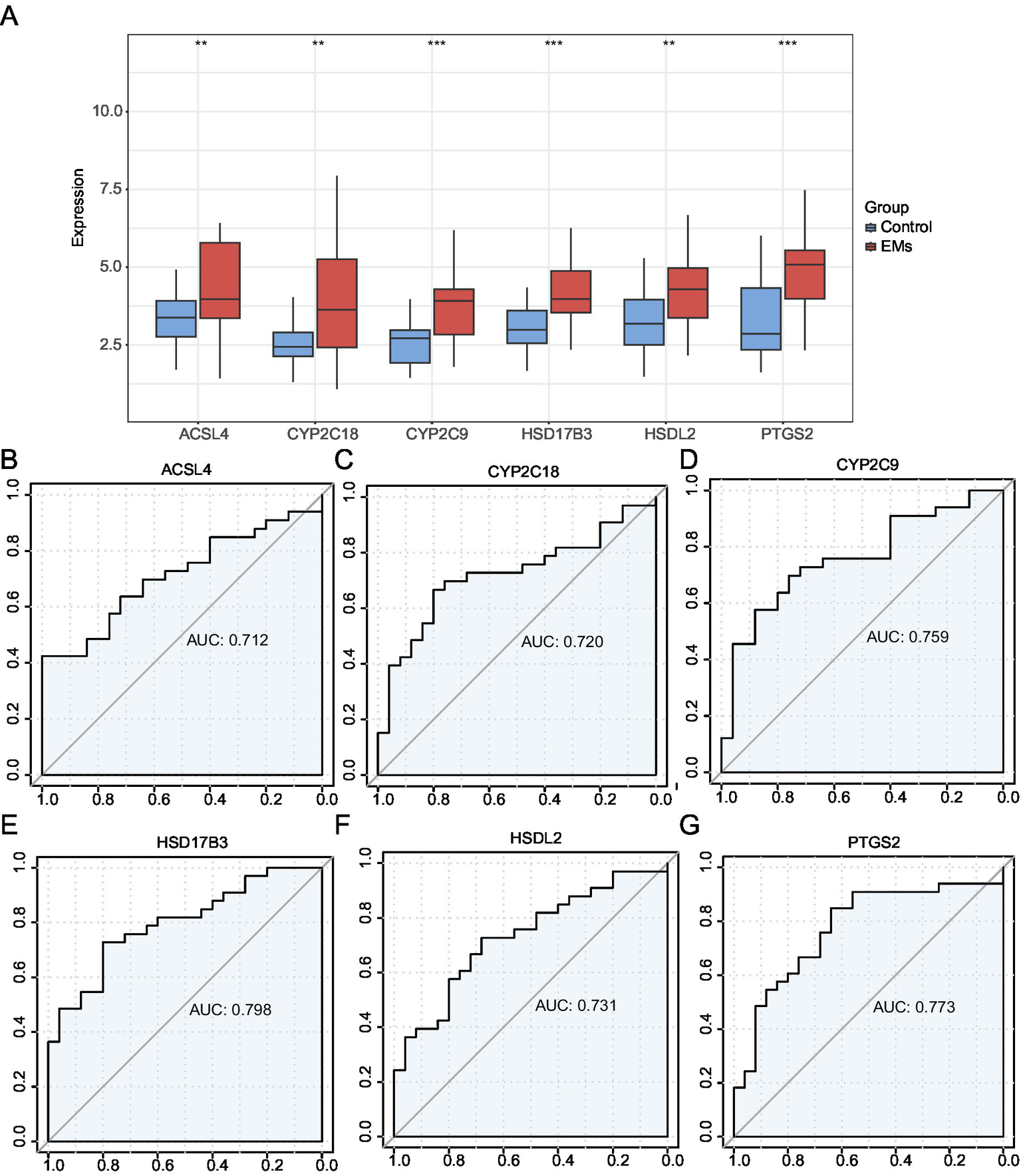 A comparative chart was constructed based on the expression levels of hub genes to further investigate the differential expression of the hub genes between the Endometriosis and Control groups within the integrated GEO datasets. Next, the R package pROC (version 1.18.5) was used to generate an ROC curve for the hub genes, thereby enabling the calculation of the area under the curve (AUC). This analysis assessed the diagnostic efficacy of hub gene expression in relation to the occurrence of endometriosis.