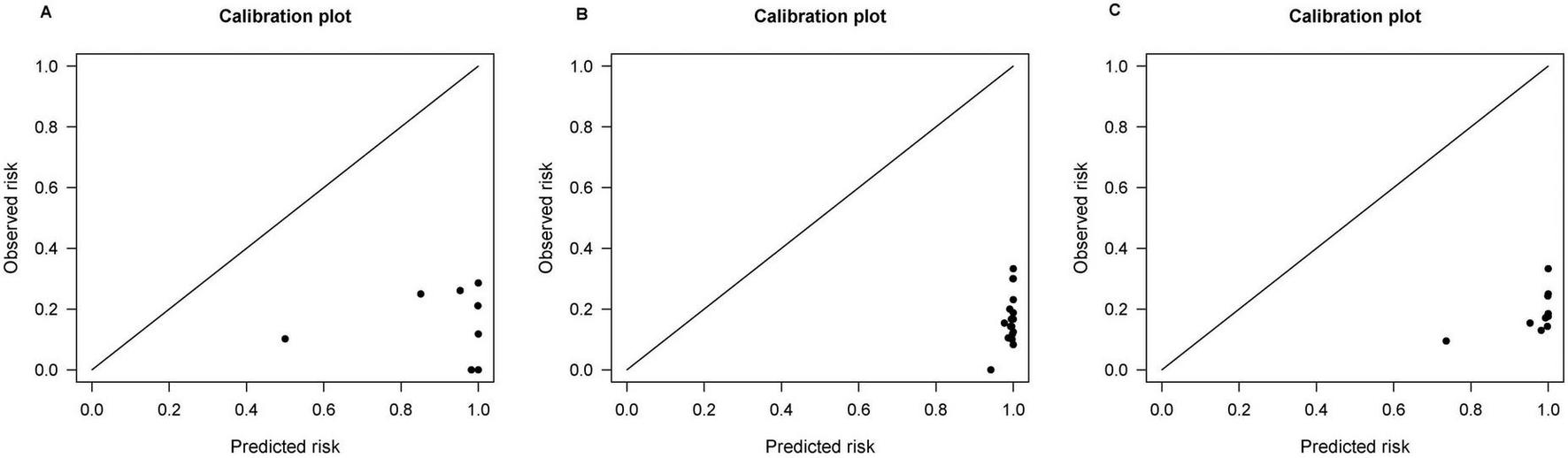 Data were extracted from the studies according to the critical assessment and data extraction checklist for systematic reviews of predictive model studies (19). The extracted information included: authors, year of publication, country, sample size of the study, and number of HCC cases included in the study; age, gender, follow-up time, and laboratory test data of the study population (including whether antiviral treatment was used, proportion of HBeAg-positive patients, proportion of patients with cirrhosis, HBV DNA, ALB, ALT, PLT, TBil, and AFP); and the model’s discrimination (C-index and 95% confidence interval) and calibration, i.e., the ratio of the number of observed [observed (O)] HCC cases to the number of expected [expected (E)] HCC cases (O:E).