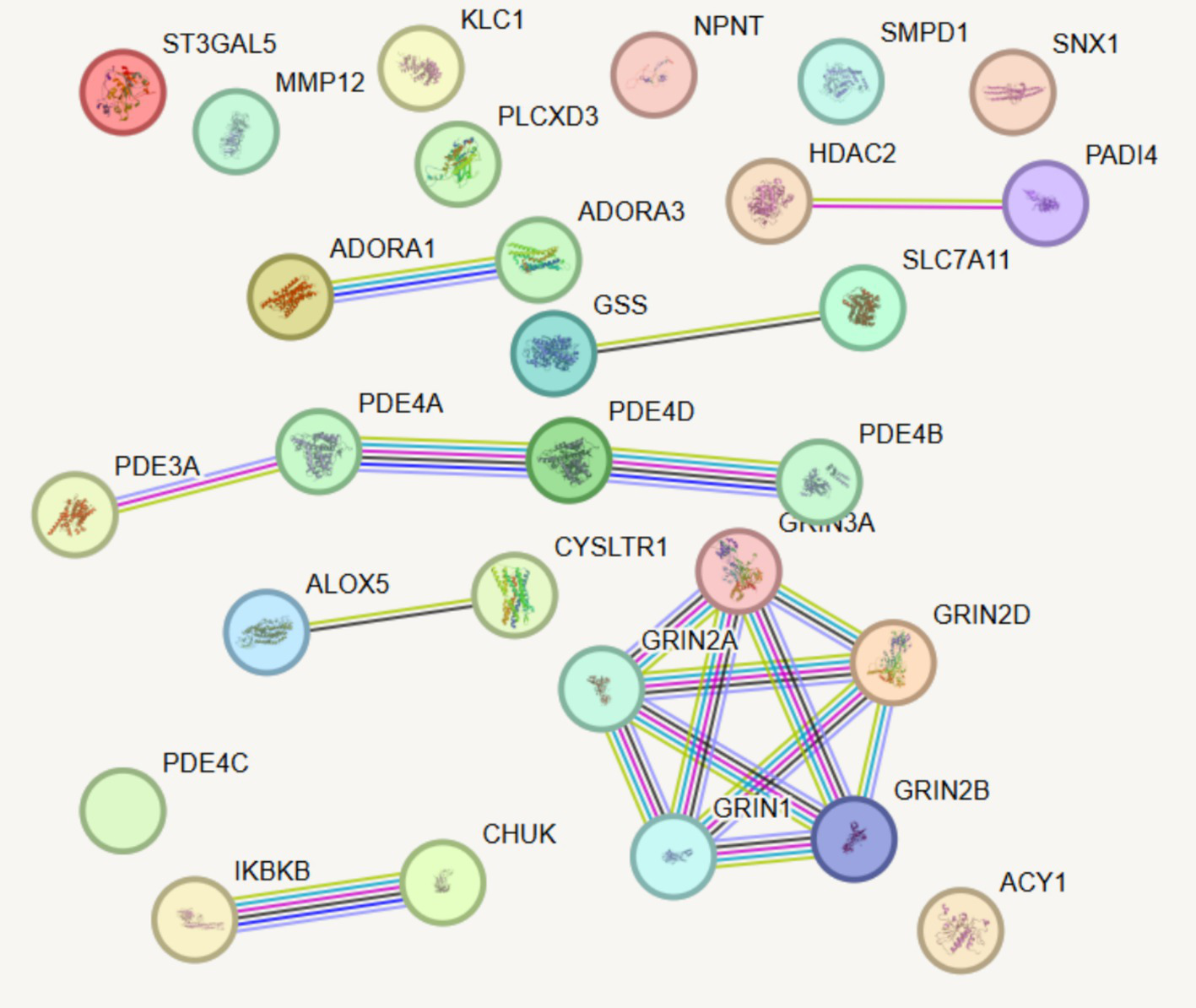 PPI network analysis integrating existing drug targets with newly identified candidate proteins associated with COPD. Line thickness indicates the predicted strength of protein–protein interactions, with thicker lines representing stronger interactions.