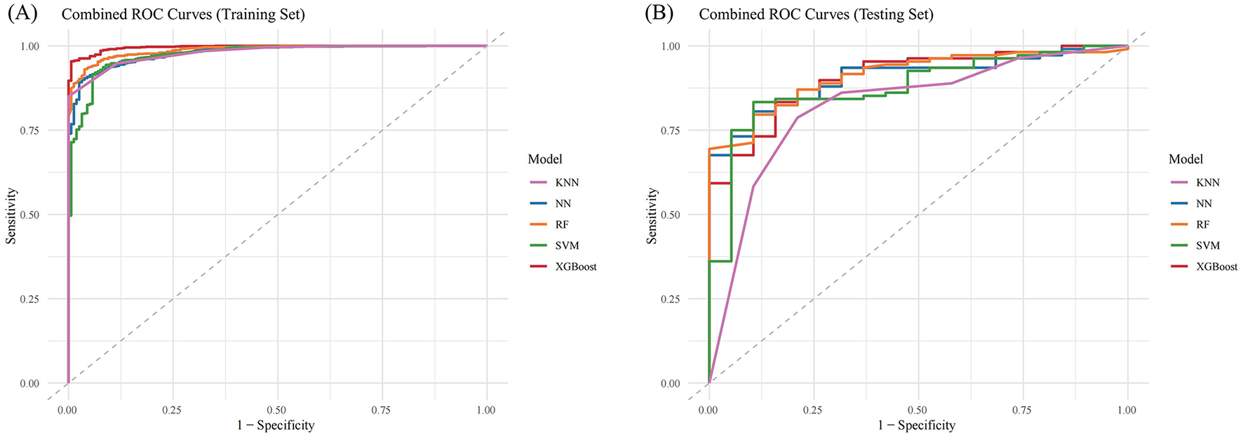 The dataset was divided into training and testing sets based on the time of patient visits and the hospital of treatment. Five ML models were then developed for analysis: SVM model was implemented using the e1071 package in R, RF model with the randomForest package in R, KNN model with the kknn package in R, XGBoost model with the xgboost package in R, and NN model with the nnet package in R.