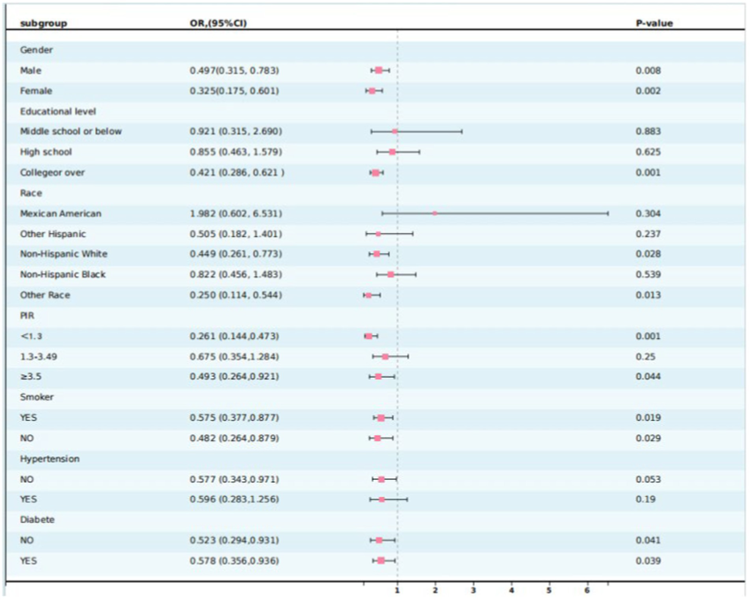 Baseline characteristics were described as means (95% confidence intervals) (CIs) for continuous variables and numbers (percentages) for categorical variables. Student’s t-test was used to compare continuous data, and chi-square test was used to compare categorical data. Logistic regression models were used to estimate the odds ratios (ORs) and 95% confidence intervals for the association between PA and MASLD. Three logistic regression models were executed to explore the association between PA and MASLD based on covariate adjustment: Model 1: Unadjusted for covariates; Model 2: adjusted for demographic variables (PIR, age, sex, ethnicity, and educational level); Model 3: Model 2 served as a base and was further adjusted for smoking status, hypertension, diabetes, and serum markers (ALT, AST, and ALB). Subgroup analyses were performed based on the following covariates: Ethnicity, sex, education level, PIR, smoking, hypertension, and diabetes. In addition, multivariate logistic regression analyses were employed to investigate the association between weekend warriors and MASLD, using participants who exercised regularly as the reference group, excluding both inactive and underactive participants. Results are presented as ORs and CIs.