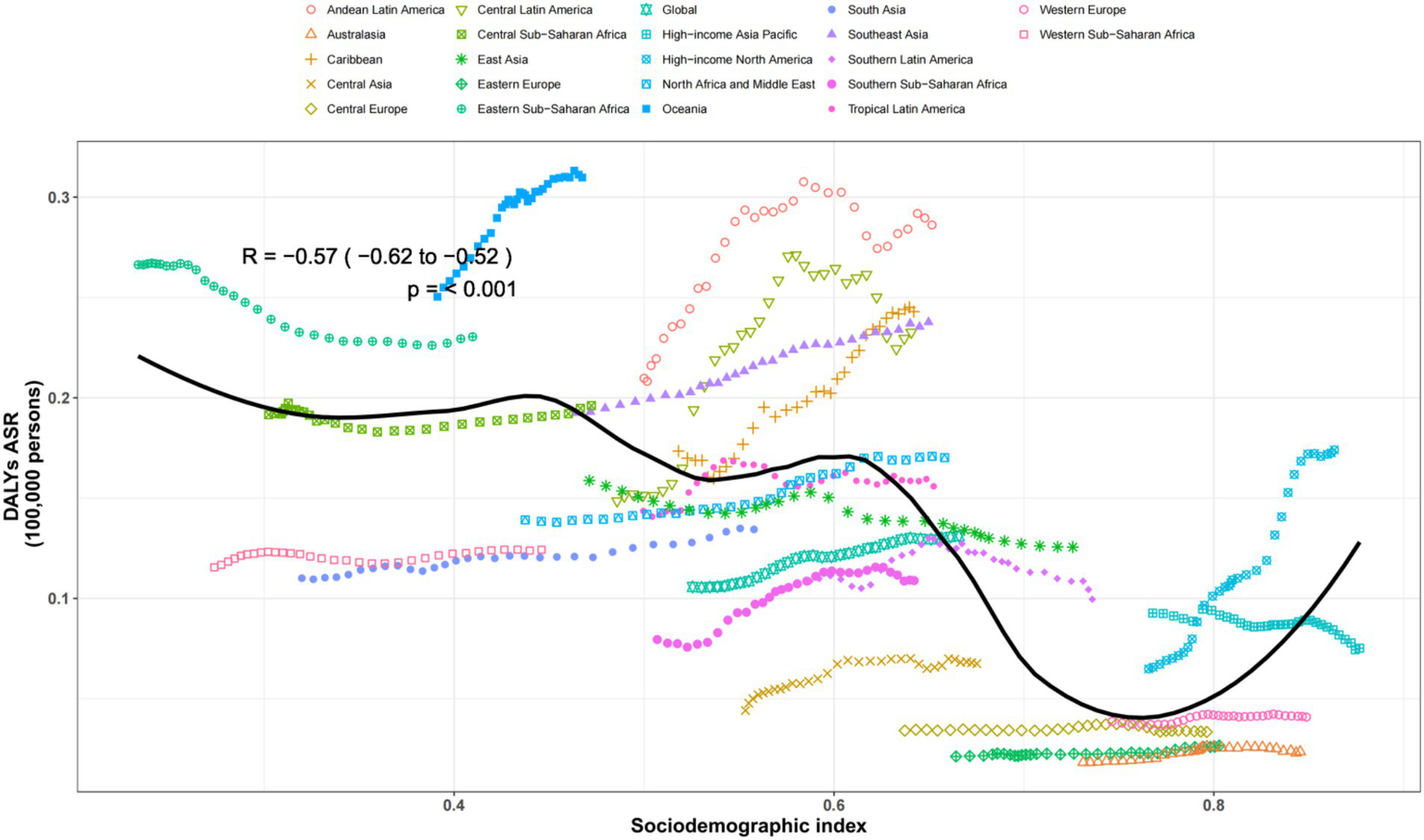 The regular pattern of different SDI levels and the ASDAR was stable across countries and territories. From Figures 5, 6, the ASRs for DALYs showed a negative correlation with SDI, indicating that higher SDI indicates lower disease burden (Figures 5, 6).