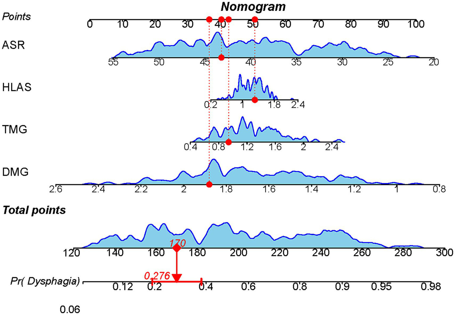 In conclusion, we utilized four key risk factors (ASR, HLAS, TMG and DMG) identified using multifactorial regression analysis to construct a robust predictive model for dysphagia. This nomogram model offers an improved framework for assessing dysphagia risk in patients with COPD.