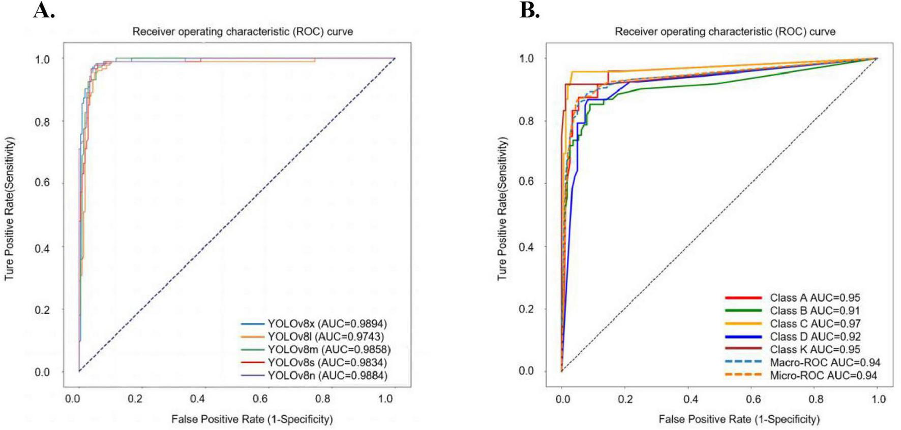 At each node, a deep learning model is trained, and the parameters for TPF feature recognition are aggregated across the SL network to update the overall model. As shown in Sites 1, 2, and 3 of Figure 3B, the deep learning nodes receive instructions from service nodes and collaboratively execute the training process (18, 22, 34, 41, 44, 45). Each node in the network holds its own original healthcare data at the local site. We adapted the distributed SL model based on the previously trained YOLOv8 deep learning model to assess its effectiveness in terms of data security and performance. A comparative analysis was conducted between centralized, local, and SL models to evaluate the performance of the SL algorithms. The YOLOv8 code was specifically modified to ensure compatibility with our SL framework. Hyperparameters and configurations used in training were tailored for the experiment, while other settings followed the official best practices for YOLOv8.