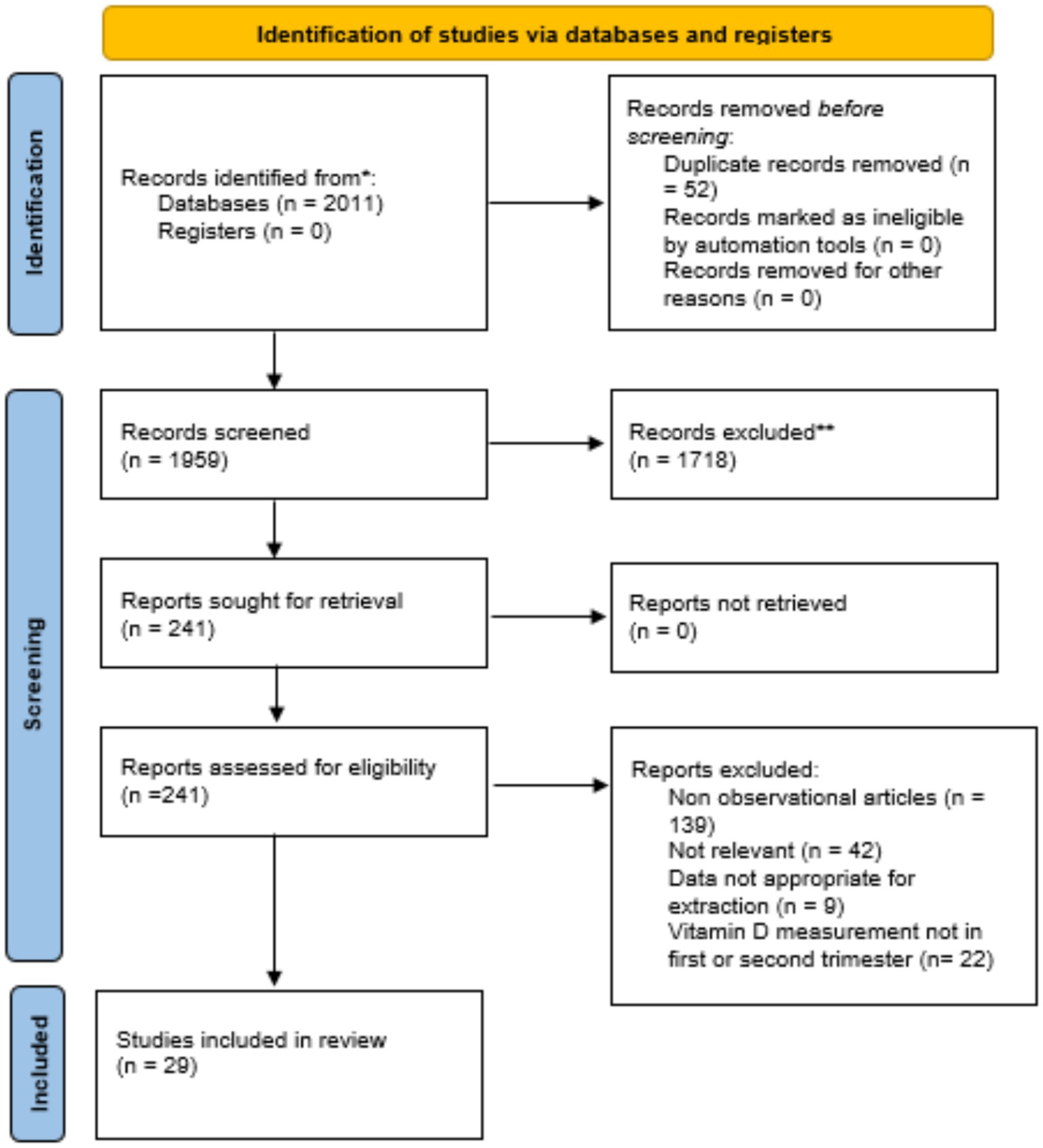 An initial search as described in Table 1 yielded 2,011 studies, of which 52 duplicates were removed, leaving 1,959 records. Abstract screening excluded 1,718 studies, resulting in 241 articles for full-text review. After this stage, 212 studies were eliminated, leaving 29 eligible for meta-analysis (Figure 1). These studies, published between 2007 and 2023, included a total of 74,061 pregnant women with vitamin D measurements obtained during the early or middle pregnancy.