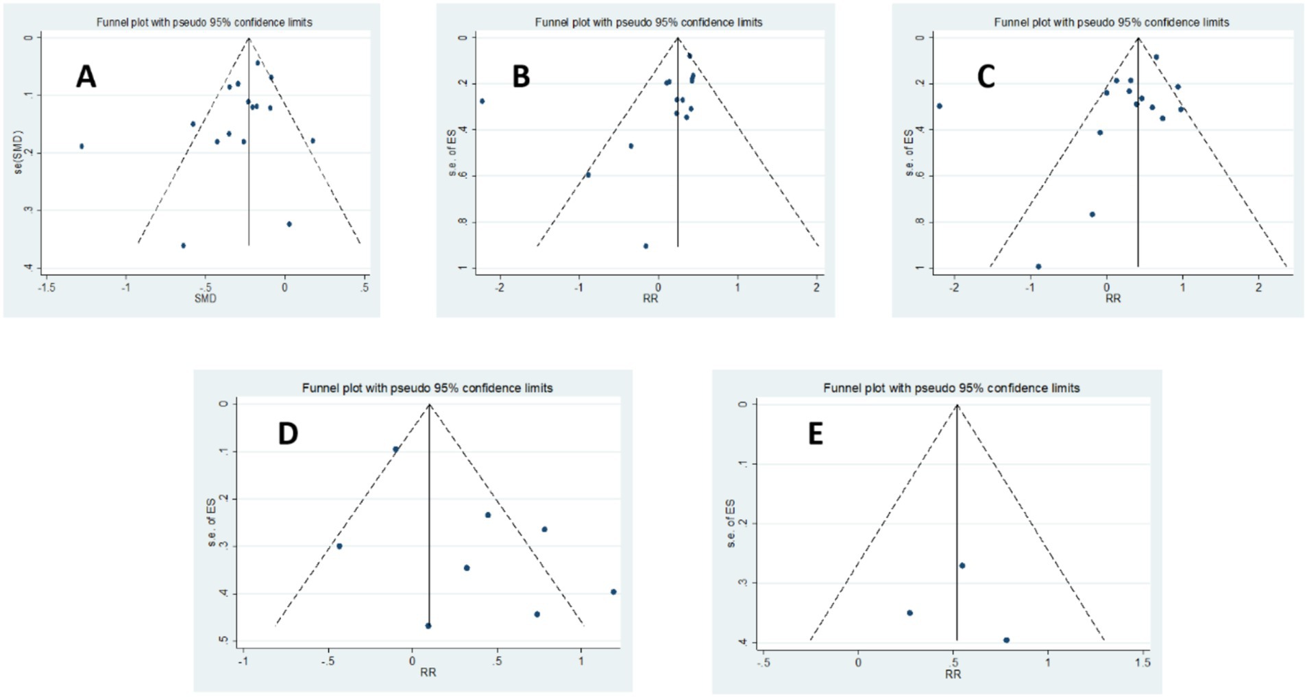 Figure 2. Funnel plot of the studies represented in the meta-analysis; (A) Vitamin D concentration in preeclampsia versus normal pregnancy, (B) Sufficient levels of Vitamin D (≥75 nmol/L) versus Insufficient levels of Vitamin D (50–75 nmol/L or 37.5–75 nmol/L), (C) Sufficient Levels of Vitamin D (≥75 nmol/L) versus Deficient Levels of Vitamin D (<50 nmol/L or <37.5 nmol/L), (D) Sufficient or Insufficient Levels of Vitamin D (≥50 nmol/L) versus Deficient Levels of Vitamin D (<50 nmol/L or < 37.5 nmol/L), (E) Sufficient Levels of Vitamin D (≥75 nmol/L) versus Insufficient or Deficient Levels of Vitamin D (<75 nmol/L).