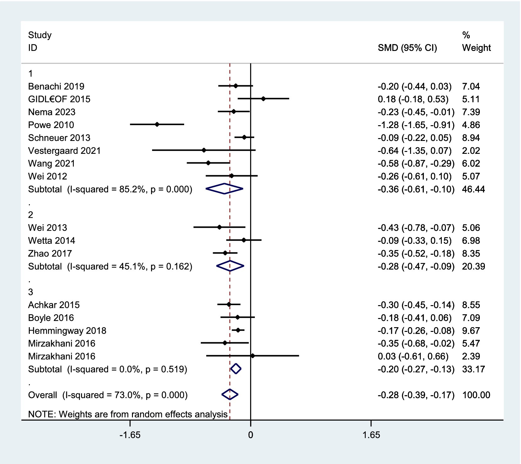 Figure 3. Forest plot for vitamin D concentration in preeclampsia versus normal pregnancy. 1. Early pregnancy, 2. Middle pregnancy, 3. Early or middle pregnancy.