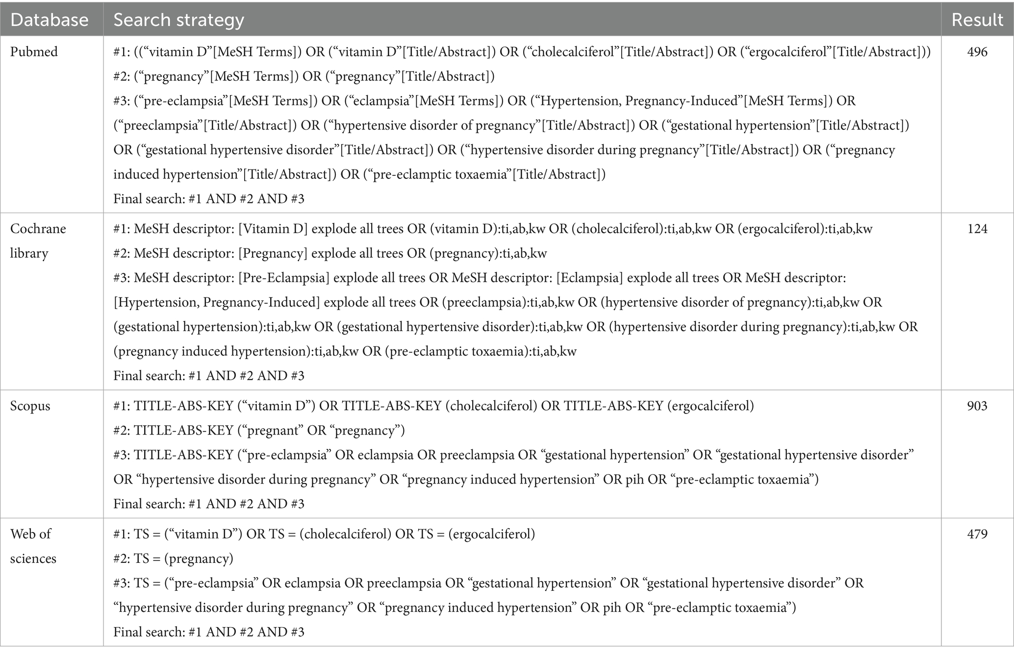 An advanced literature search was performed up to June 23, 2023 to retrieve relevant articles from following databases: PubMed, Scopus, Web of Science, and Cochrane Library. A comprehensive search strategy was developed using keywords and Medical Subject Headings (MeSH) terms related to vitamin D, pregnancy, and preeclampsia. These terms were combined using the Boolean operator “AND” without imposing restrictions on publication date, type, or language. Database-specific search syntax was employed for each database. To enhance the search yield, reference lists of relevant systematic reviews were manually screened. Two independent reviewers conducted the search process, with discrepancies resolved through consensus.