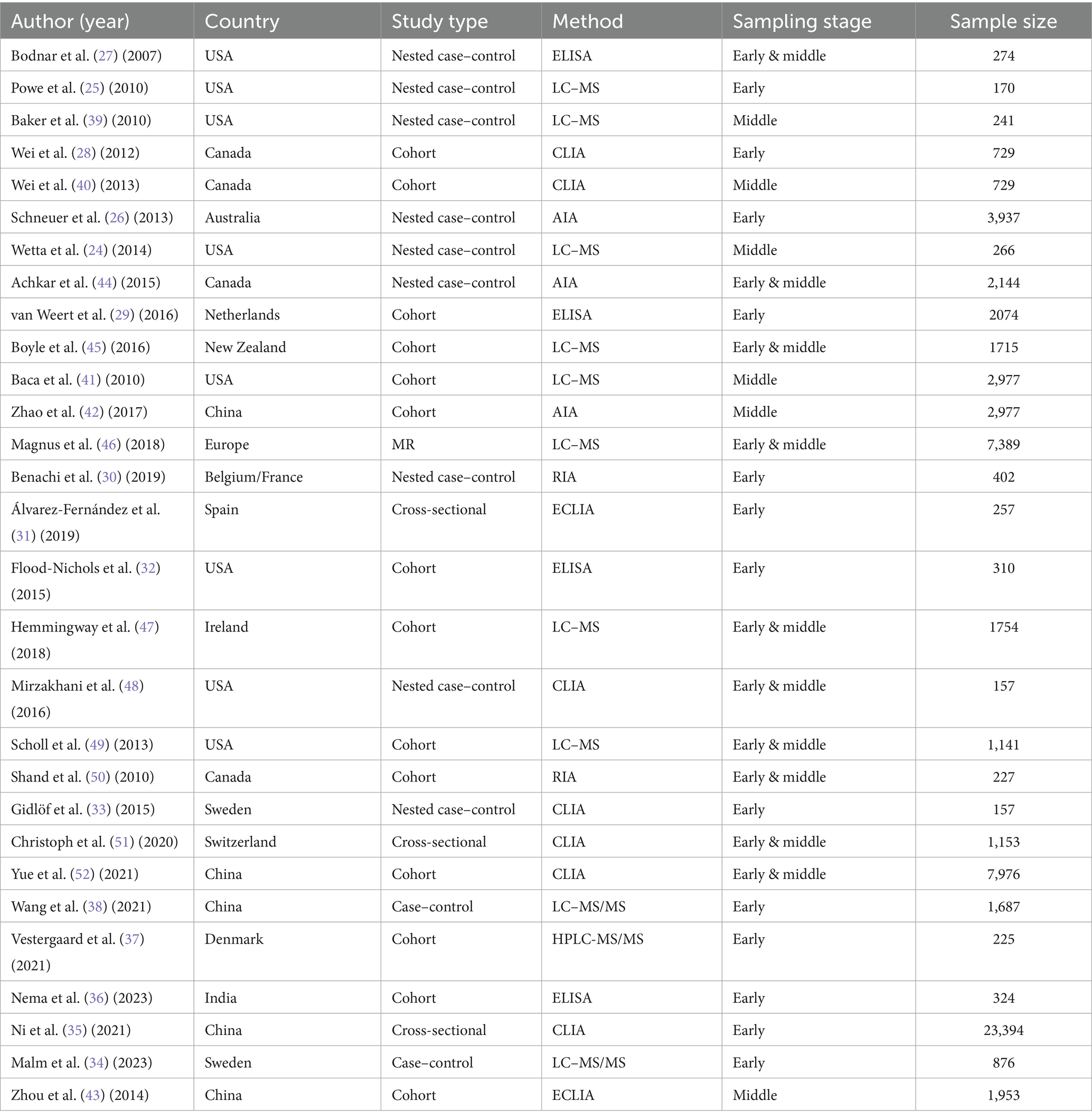 Thirteen studies quantified maternal serum concentrations of vitamin D at early pregnancy (25, 26, 28–38), six studies at middle pregnancy (24, 39–43), and 10 other studies measured maternal vitamin D concentrations during a time period overlapping between the two (<22 weeks) (27, 44–52). Out of articles included, eight were carried out in USA (24, 25, 27, 32, 39, 41, 48, 49), five were from China (35, 38, 42, 43, 52), four from Canada (28, 40, 44, 50), two from Australia and New Zealand (26, 45), one from India (36), and the rest were in Europe (29–31, 33, 34, 37, 46, 47, 51). A summary of the included studies is presented in Table 2, with detailed characteristics available in Supplementary Table S1.