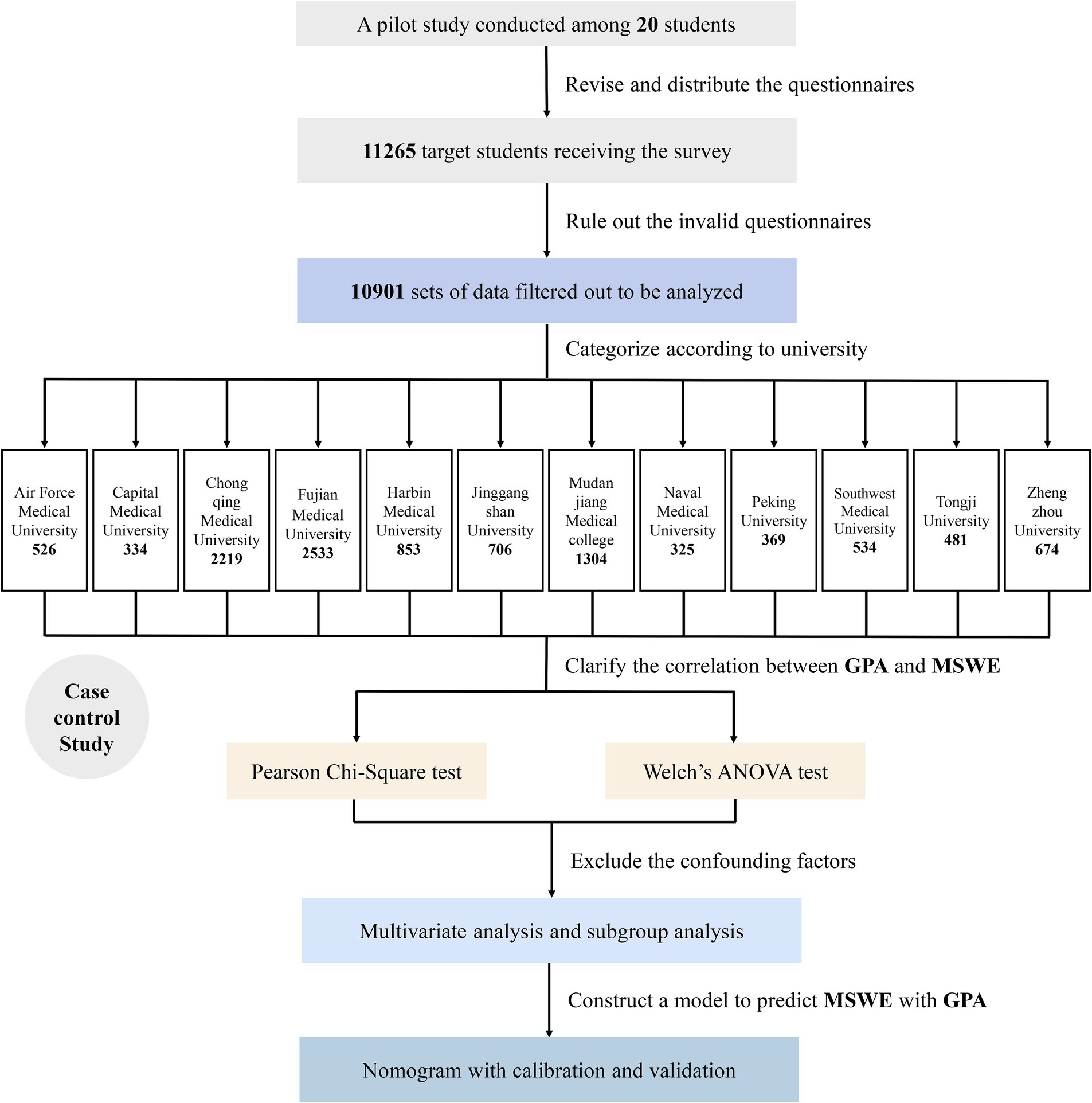 In our previous studies (15–20), we developed a comprehensive nomogram model to predict self-regulated learning (SRL) levels among Chinese medical undergraduates. Specifically, “GPA,” the abbreviation of grade point average, was demonstrated to be an independent predictor of SRL levels. Fundamental evidence has been established to show the close relationship between SRL levels and WE (21, 22). However, the relationship between GPA and MSWE has not yet been clearly elucidated (15). GPA is imperatively recognized as an overall measure of students’ performance and capability in terms of synthetic learning. Therefore, our study aimed to identify and clarify the significant association between GPA and MSWE. Meanwhile, we further analyzed the potential reasons behind our findings and proposed some practical strategies to ameliorate MSWE.
