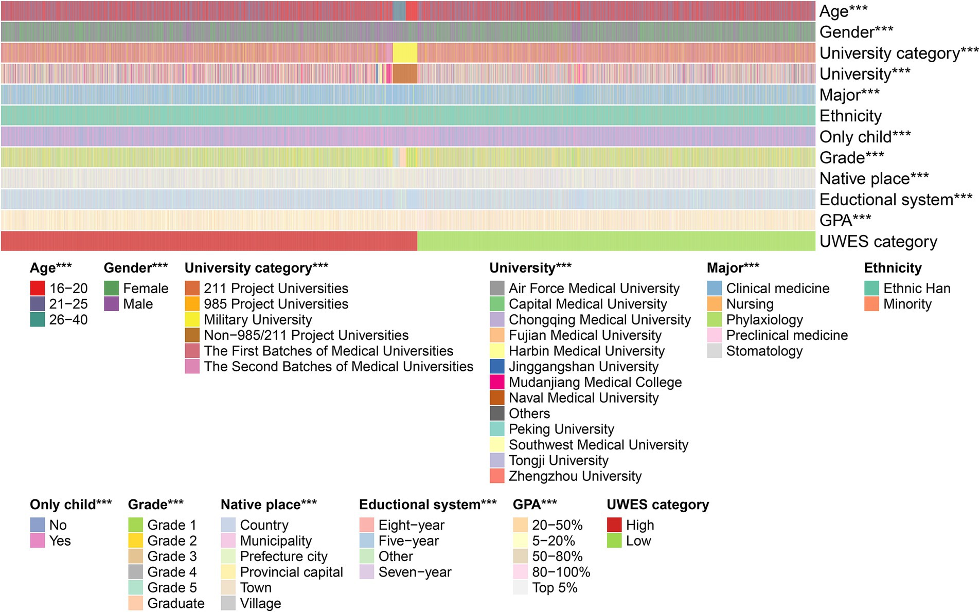 Figure 2. Heatmap visualizing the distribution of the target students’ answers to each single question in the questionnaire. The students’ UWES scores were divided into low and high categories. Statistical significance for each variable across the UWES categories is indicated by star icons, and three stars represent a p-value <0.001.