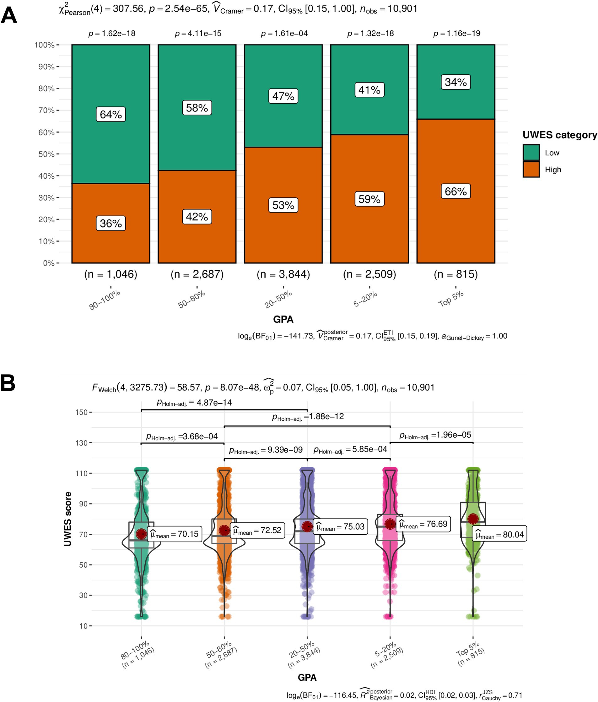 Figure 3. Results of the univariate analysis illustrating the relationship between GPA (exposure) and UWES scores and categories. (A) The results of Pearson’s chi-squared test visualized in a boxplot. Vertical and horizontal axes stand for the percentage of the UWES score and GPA category, respectively. The UWES categories exhibited a statistically significant distribution within each GPA group (p < 0.05). (B) The results of Welch’s ANOVA visualized in a violin plot. Vertical and horizontal axes stand for the UWES score and GPA category, respectively. The medical students with higher GPAs tended to have a higher median UWES score. UWES, Utrecht Work Engagement Scale; GPA, grade point average.