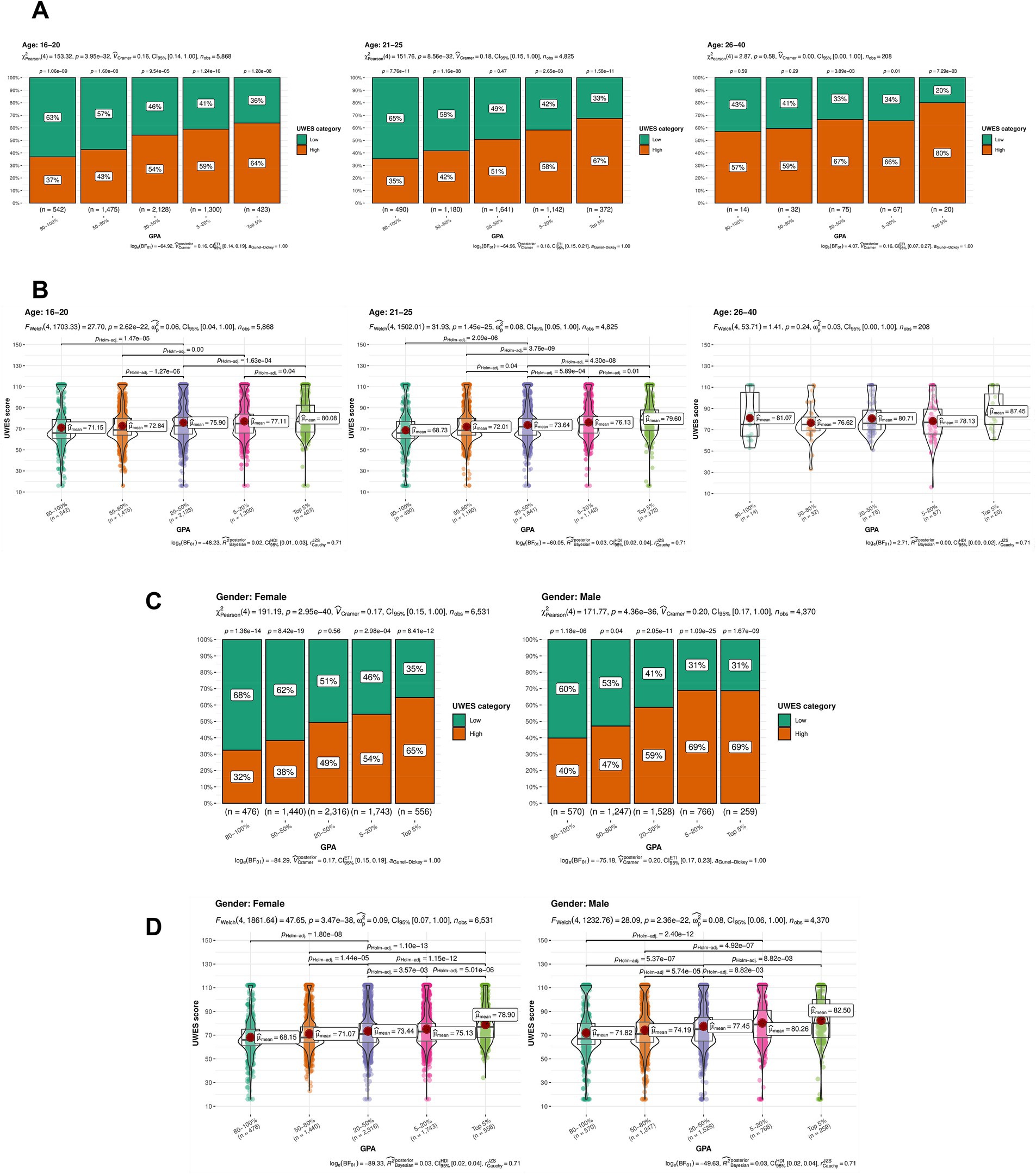 Figure 4. Results of the subgroup analysis, excluding the confounding effects of age and gender. (A) The results of Pearson’s chi-squared test for age subgroups, visualized in boxplots. Vertical and horizontal axes stand for the percentage of the UWES score and GPA category, respectively. The group was age category. Statistical significance of the UWES categories was still present within the age subgroups of 16–20 (p = 3.95e-32) and 21–25 (p = 8.56e-32). (B) The results of Welch’s ANOVA for age subgroups, visualized in violin plots. Vertical and horizontal axes stand for the UWES score and GPA category, respectively. The group was age category. Statistical significance of the UWES scores was still present within the age subgroups of 16–20 (p = 2.62e-22) and 21–25 (p = 1.45e-25). (C) The results of Pearson’s chi-squared test for gender subgroups, visualized in boxplots. Vertical and horizontal axes stand for the percentage of the UWES score and GPA category, respectively. The group was gender. The UWES categories still showed statistical significance in the women (p = 2.95e-40) and men (p = 4.36e-36) subgroups. (D) The results of Welch’s ANOVA for gender subgroups, visualized in violin plots. Vertical and horizontal axes stand for the UWES score and GPA category, respectively. The group was gender. The UWES scores still showed statistical significance in the women (p = 3.47e-38) and men (p = 2.36e-22) subgroups.