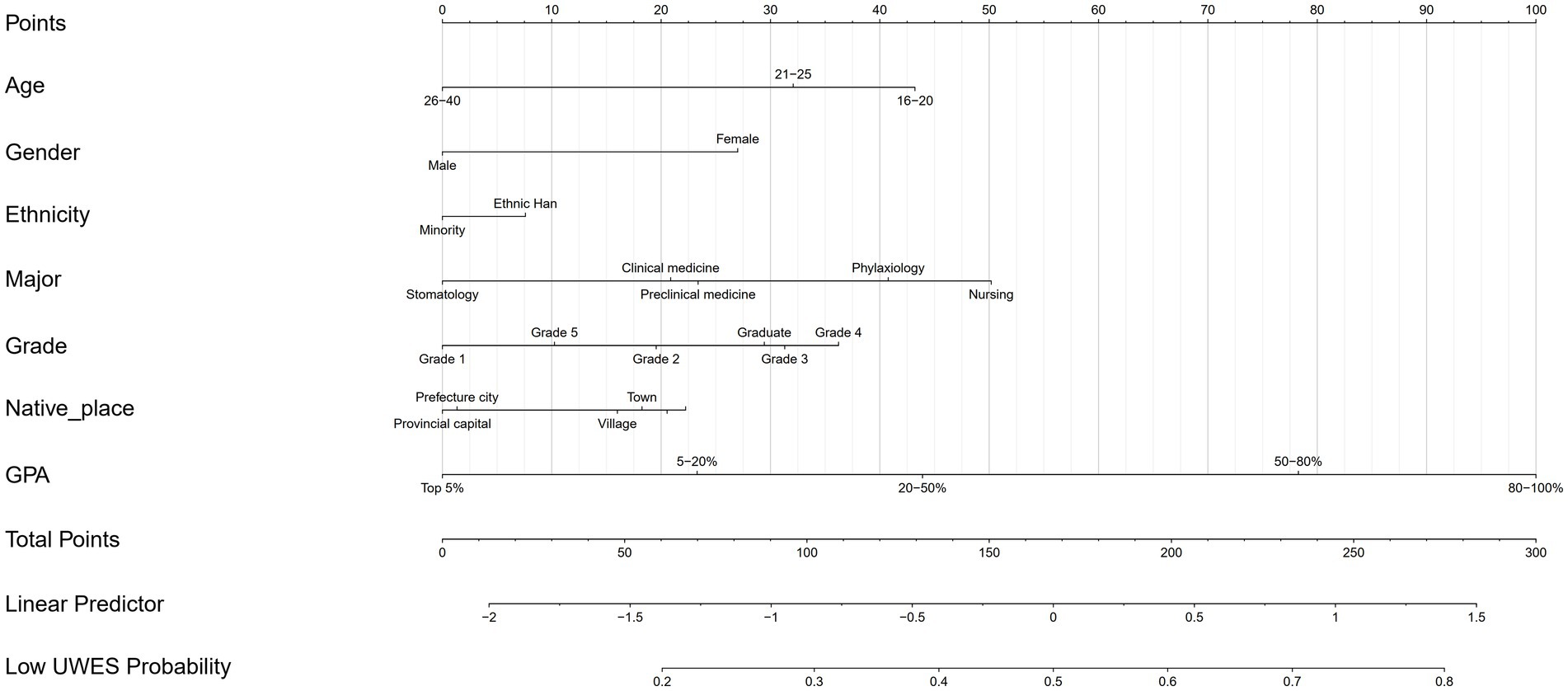 The nomogram (Figure 5) was constructed based on GPA coupled with demographic information (age, gender, ethnicity, and native place) and key medical education-related variables (major and grade) to evaluate the probability of low UWES scores, also known as worse MSWE.