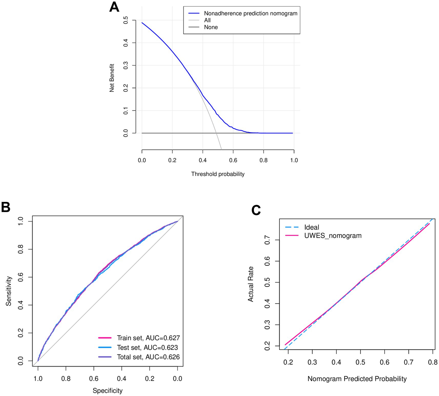 The efficacy of this nomogram was checked using bootstrap internal validation, which was visualized through ROC and calibration curves. For DCA, the model’s curve is considered clinically useful if it lies above the reference curve across a range of relevant thresholds, indicating it reduces unnecessary interventions while identifying important cases. In Figure 6A, when the probability of low UWES exceeded 0.3, the non-adherence evaluation nomogram demonstrated a higher net benefit compared to all other models, highlighting the range and effectiveness of our model. In addition, for the ROC curve, the curve closer to the upper-left corner signifies stronger discriminative power. The area under the curve (AUC) quantifies overall performance, with 1 indicating perfect discrimination and 0.5 representing random chance. As shown in Figure 6B, the AUC of the ROC curves was 0.627, 0.623, and 0.626 for the training set, test set, and overall set, respectively, which suggested a relatively evaluative accuracy. Moreover, for the calibration curve, the evaluated probabilities are grouped into intervals. For each interval, the mean evaluated probability and the observed event rate were computed. Figure 6C shows a high degree of overlap between the ideal and UWES evaluative nomogram curves via the calibration curve, highlighting good agreement with the actual situation.