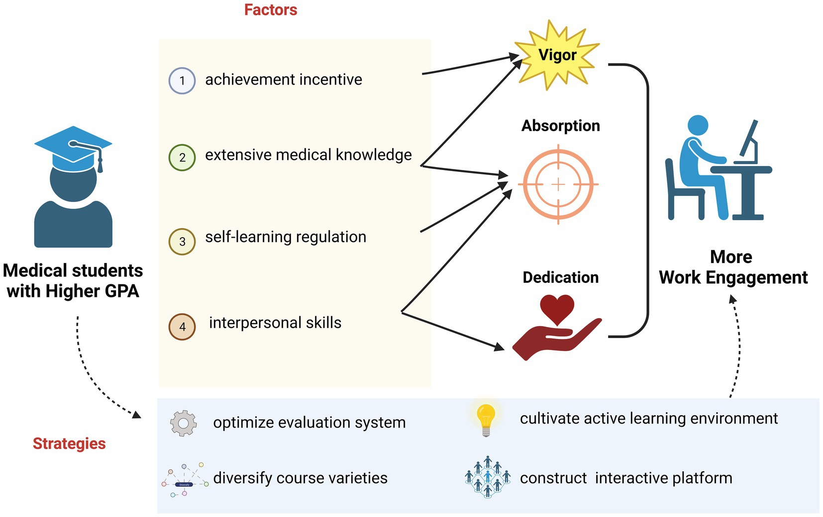 Having established the statistically significant relationship between medical students’ GPA and MSWE, we will further discuss the reasons why medical students with higher GPAs are able to show greater work engagement in learning and practice (Figure 7). It is crucial to clarify the concepts of GPA and MSWE before the discussion. GPA is defined as an overall evaluation of a student’s academic performance, combining multiple curriculum assessments according to a specific weighting scheme (30). GPA can also reflect capabilities such as achievement motivation, self-regulation, extensive knowledge, and interpersonal communication. The verified validity of GPA is what makes it a widely used criterion among most universities (31). In addition, work engagement can be specified into three dimensions: vigor (emotional motivation), absorption (immersion in work), and dedication (making contributions) (26). Accordingly, we will clarify the interaction between the comprehensive capabilities reflected by GPA and medical students’ content of WE.